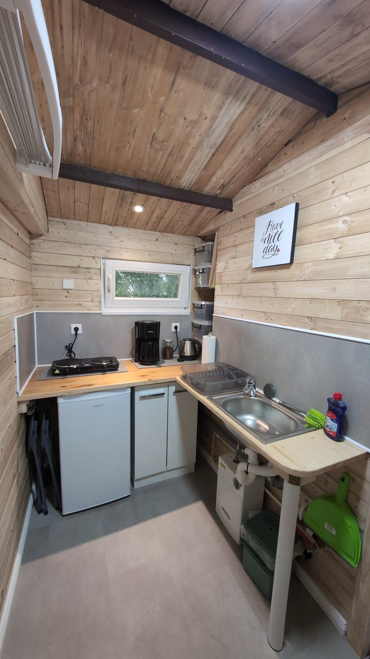 Patogi statybinė priekaba gamtos apsuptyje. Statybinė priekaba yra apie 30 m2 ploto, joje yra dvi miegamosios vietos su 140 cm ir 90 cm lova viename vagono gale. Vagono viduryje yra valgomojo zona+virtuvė su orkaite. Priešais jį yra nedidelis balkonas ir veja. Įskaičiuotas paukščių čiulbėjimas, žvaigždėtas dangus ir romantika prie laužo Svarbi detalė: lauke yra dušas ir komposto atskyrimo tualetas. Išmeskite savo produktus į esamus konteinerius.