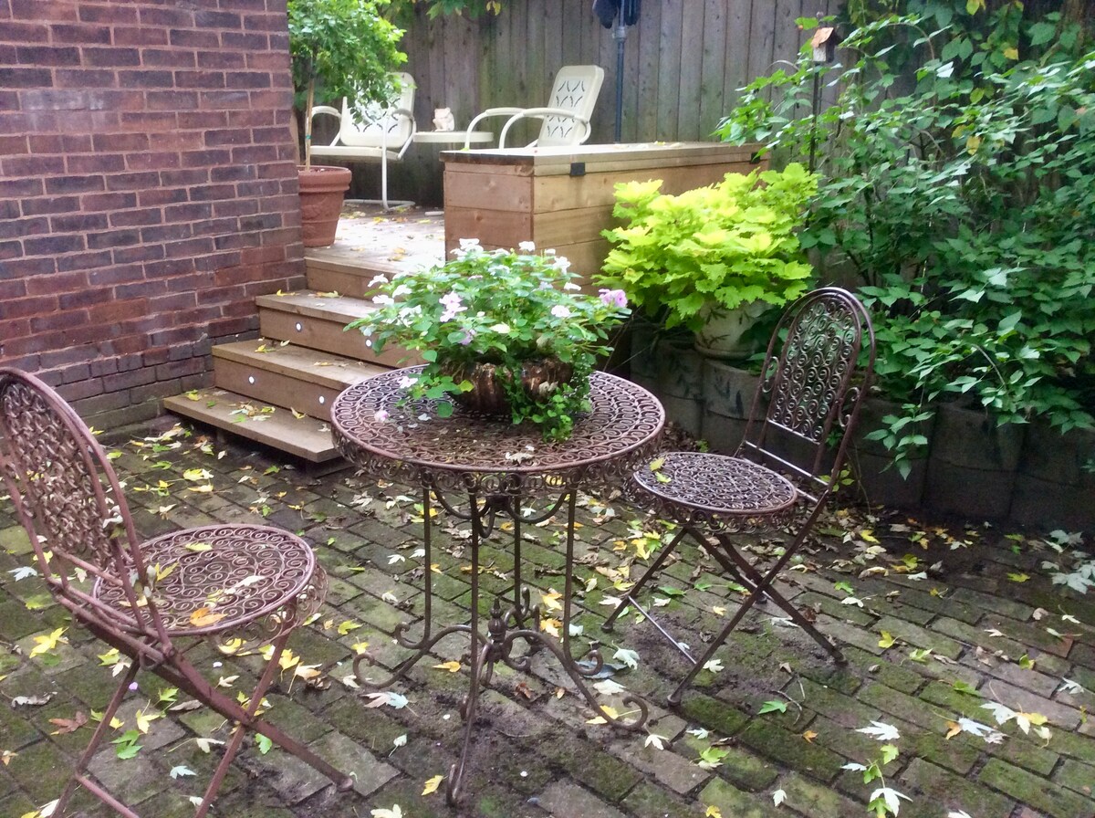 Located in a peaceful historic neighbourhood, you'll feel right at home in this Arts and Crafts residence featuring authentic finishes, hardwood floors, private courtyard garden, and deck. A quaint cottage-like gem filled with the artist's original works. Fast hi-speed Wi-Fi, premium cable. One block from streetcars. Many award-winning restaurants, jazz bars and gourmet shops. Walking distance to the core of Toronto's downtown. Street parking and city lot on the block. Superhost for 11 years.