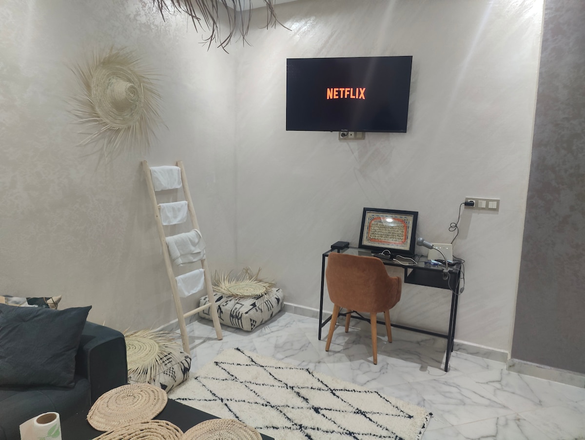 Atsipalaiduokite šioje ramioje ir elegantiškoje erdvėje, gražiame name El Hajeb miesto širdyje, kurį sudaro (2) miegamasis su balkonu, svetainė, atvira ir gerai įrengta virtuvė, karštas vonios kambarys, sporto salė, Wi-Fi, (3) išmanusis televizorius, OSN+, nemokamas Shahid ir dujinis šildymas, lova kūdikiams, rašomasis stalas jūsų darbui, terasa vakarienei lauke