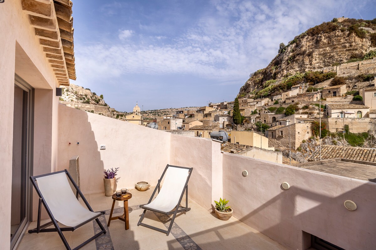 Esame istorinio centro širdyje. Nepriklausomas namas su įspūdingais panoraminiais vaizdais (apie 90 laiptelių iki jo, būdingas Modicoje), šviesus ir apgalvotai įrengtas. Terasa, svetainė su sofa, atvira virtuvė ir valgomojo stalas. Du miegamieji, vienas su didele lova(tatamis su futonu) ir gražiu vaizdu, kitas mažesnis (tatamis su futonu)ir aukštu langu. Du vonios kambariai su erdviais dušais. NEMOKAMAS WI-FI, oro kondicionierius, skalbykla. Netoli kavos, restoranų, turgaus, maisto prekių parduotuvių.