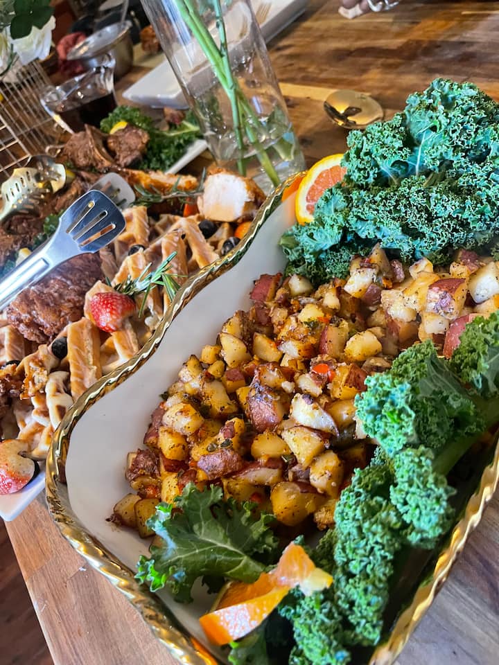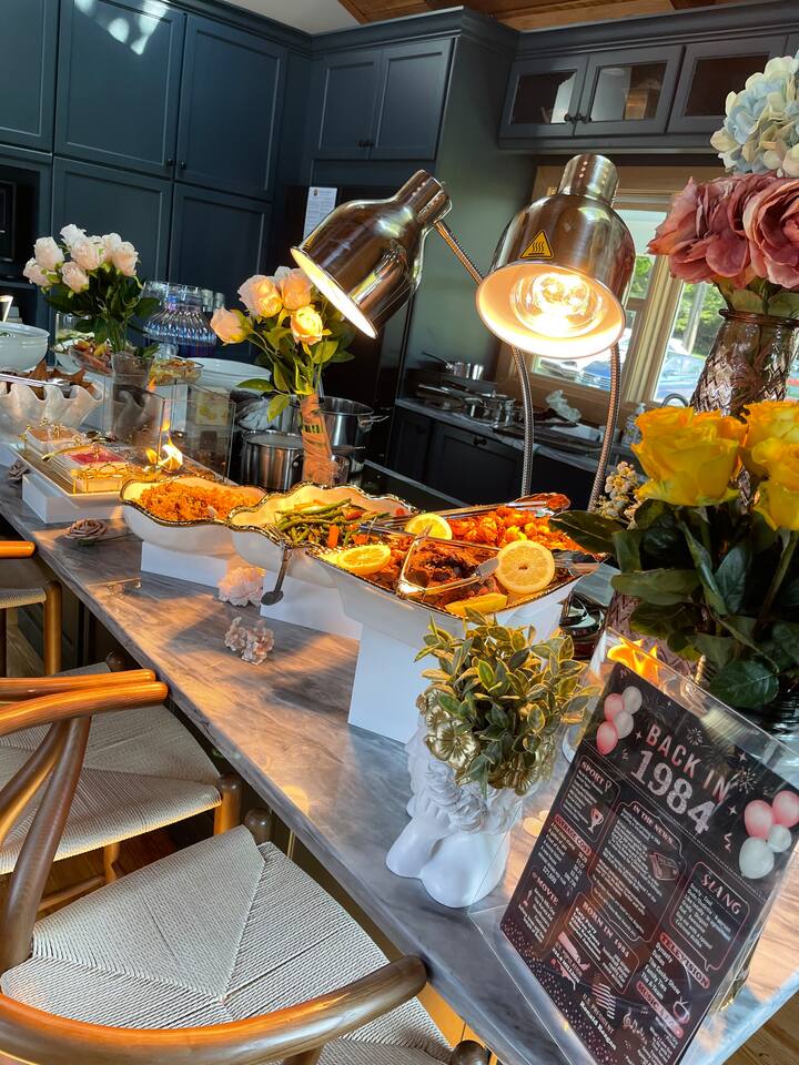 Kruopščiai pagaminti indai su švediško stalo stiliumi su gražiais patiekalų patiekalais ir stalo klojimu, atitinkančiu renginio temą.