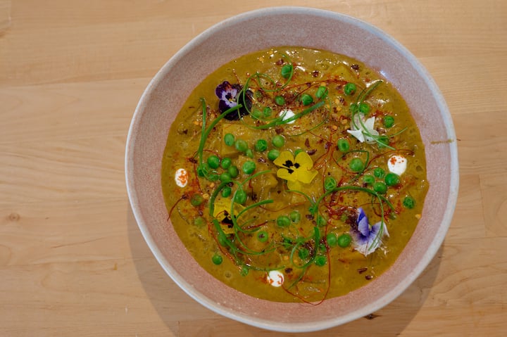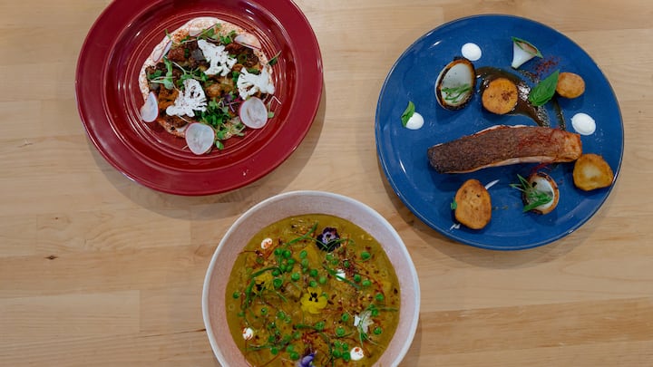 6 patiekalų patiekalas, įkvėptas kulinarinių studijų Pietryčių Azijos, Europos ir Pietų virtuvėse.