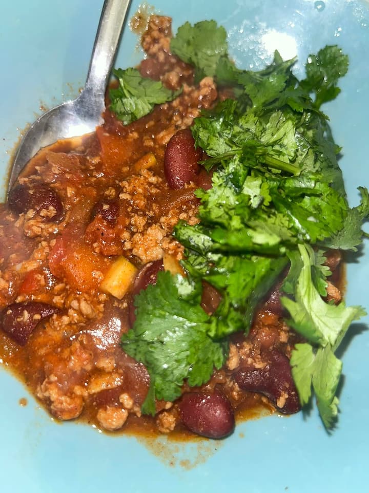 Šis čili, kuris yra tobulas, jame gausu baltymų, gausių daržovių ir subtilaus smūgio. Patiekite su kukurūzų duona, virš ryžių arba papuošta susmulkintu sūriu ir grietine.