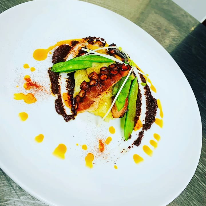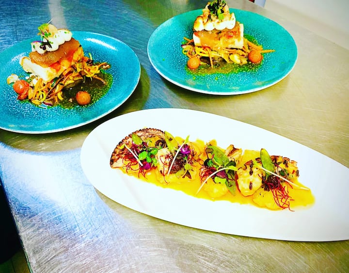 6 patiekalų degustavimo meniu su aukščiausios klasės ingredientais, meniniu sluoksniu ir kūrybingais Viduržemio jūros regiono klasikos akcentais.