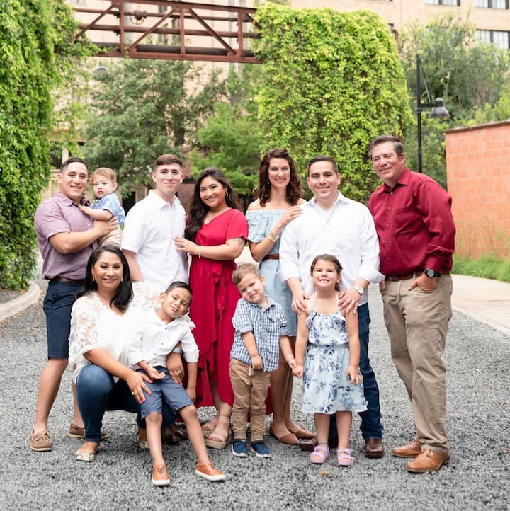Ši išplėstinė šeimos portretų sesija gali vykti jūsų nuomojamame būste arba bet kurioje San Antonijaus vietoje.