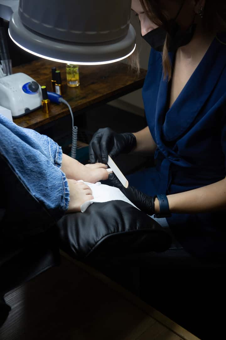 Ši išsami pėdų procedūra salone apima nagų grožį, o po to - pusiau nuolatinio lako klijavimas, kad būtų sukurtos minkštos, tvarkingos ir elegantiškos kojos.