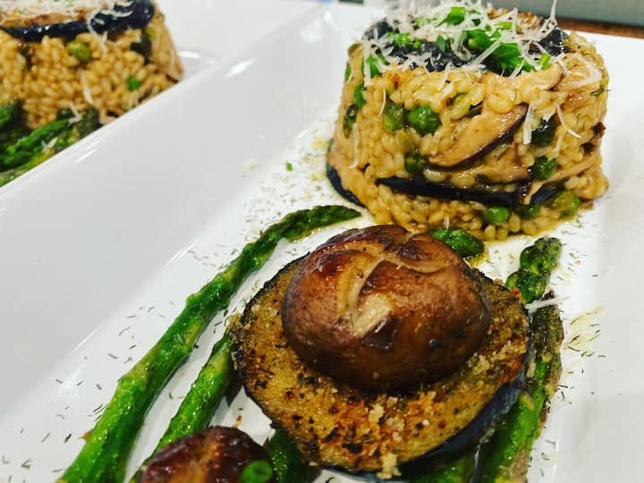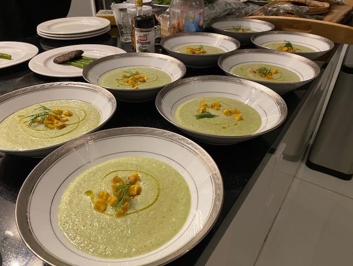 Įsivaizduokite gražiai patiektą vakarienę iš kelių patiekalų, paruoštą jūsų virtuvėje. Jokio streso, jokio indų plovimo, tik nepamirštami skoniai. Mėgaukitės rafinuotu augaliniu degustaciniu meniu, sukurtu su ryškiomis skoninėmis savybėmis, sezoniniais ingredientais ir elegantišku patiekimu. Jūsų patirtis apima BBQ „mėsos“ rutuliukų užkandį, atšaldytą agurkų ir salierų gaspačą su trumais ir krapais, šiltą grybų pyragą, pagrindinį patiekalą, kurį virėjas paruošė pagal jūsų pageidavimus, ir firminį desertą, kurį svečiai tiesiog dievina.
