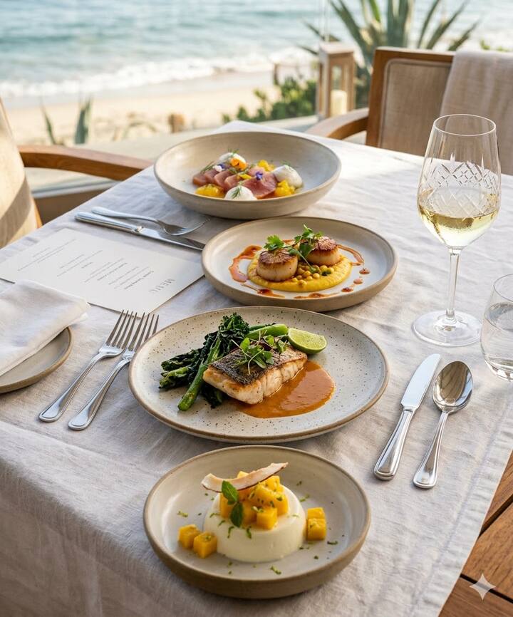 Atsipalaiduokite mėgaudamiesi 4 patiekalų vakariene, kurią geriausiai apibūdintų Balio pakrantės virtuvės patiekalų ir šiuolaikinių Europos kulinarinių metodų derinys. Meniu yra vytinto tuno su citrusinių vaisių žele ir kokosų puta, apkeptų šukučių su kukurūzų tyrėmis ir čili aliejumi, ant grotelių keptos dienos žuvies su baltuoju sviesto ir sambalo padažu bei apkeptomis žalumynėmis ir kokosų panna cotta su mangu ir žaliosios citrinos žievelėmis.