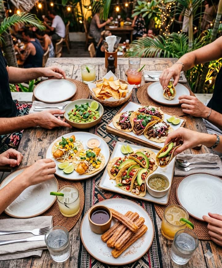 Mėgaukitės lotynišku gatvės maistu, pagamintu iš geriausių Balio produktų. Mėgaukitės 4 patiekalų valgiu, kurį sudaro šviežias gvakamolė su manijokų traškučiais, Baja stiliaus žuvies takai su čili majonezu, lėtai kepta jautienos barbekiu arba keptos vištienos takai ir čuros su tamsia šokolado ir cinamono cukrumi.
