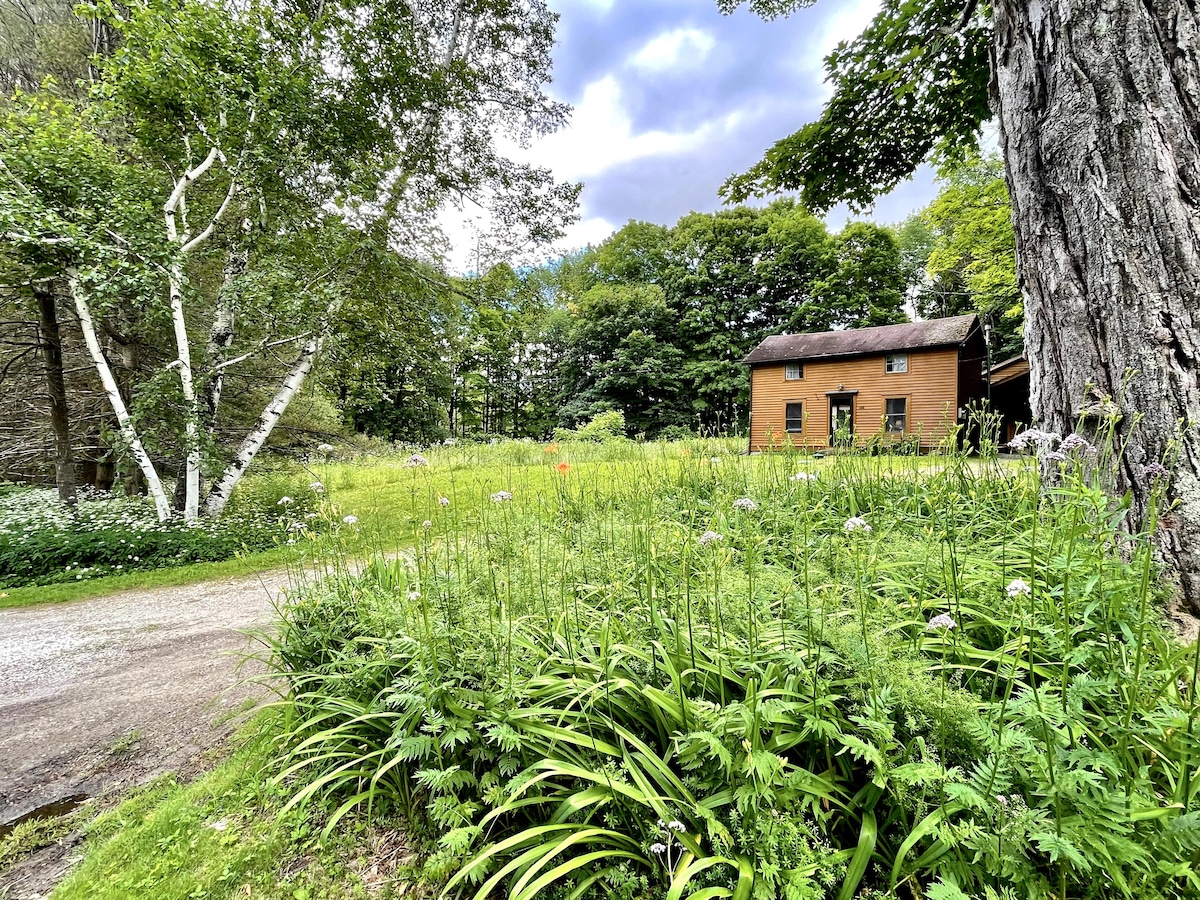 Berkshires žavesys šiame pilnai renovuotame 1800 m. pastate ir sijų sodyboje, įrengtoje 5 akrų plote. Būste yra atviro plano svetainė/valgomasis/virtuvė su dujine virykle ir dujiniu 3 pusių židiniu, gražus saulės kambarys, pagrindinis kambarys apačioje ir 2 miegamieji, vonia ir sėdėjimo zona viršuje. Erdvus denis su vaizdu į platų būstą Patogiai įsikūręs tarp žavingų Stockbridge, Lenox ir Great Barrington miestų. Mus supa 4 slidinėjimo zonos, artimiausia yra už 10 minučių kelio! Taip pat galima pavalgyti.