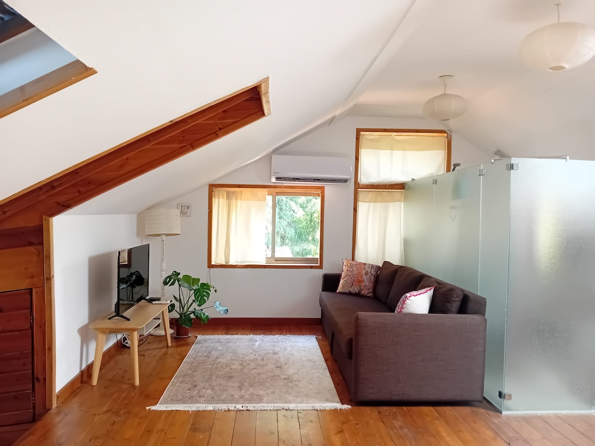 Patogi renovuota saulėta studija su dvigule lova, a/c, privačiu WC, dušu, pilnai įrengta virtuve, stogo sodu, nemokama automobilių stovėjimo aikštele, bendra pastoge pirmame aukšte, greitas belaidis internetas, nemokami pusryčiai pagal pageidavimą. Puiki vieta. Atstumas pėsčiomis iki Beit Protea, IDC, autobusų stoties! 7 min. automobiliu iki paplūdimio. Pilna patalynė+rankšluosčiai, nuolatinis karšto vandens ir geriamojo vandens tiekimas, plaukų džiovintuvas, espreso aparatas, jogos kilimėlis. Jei pasiilgsite savo mylimo augintinio - mūsų šuo Donna jūsų paslaugoms😀. Kalba EN, HE, RU.