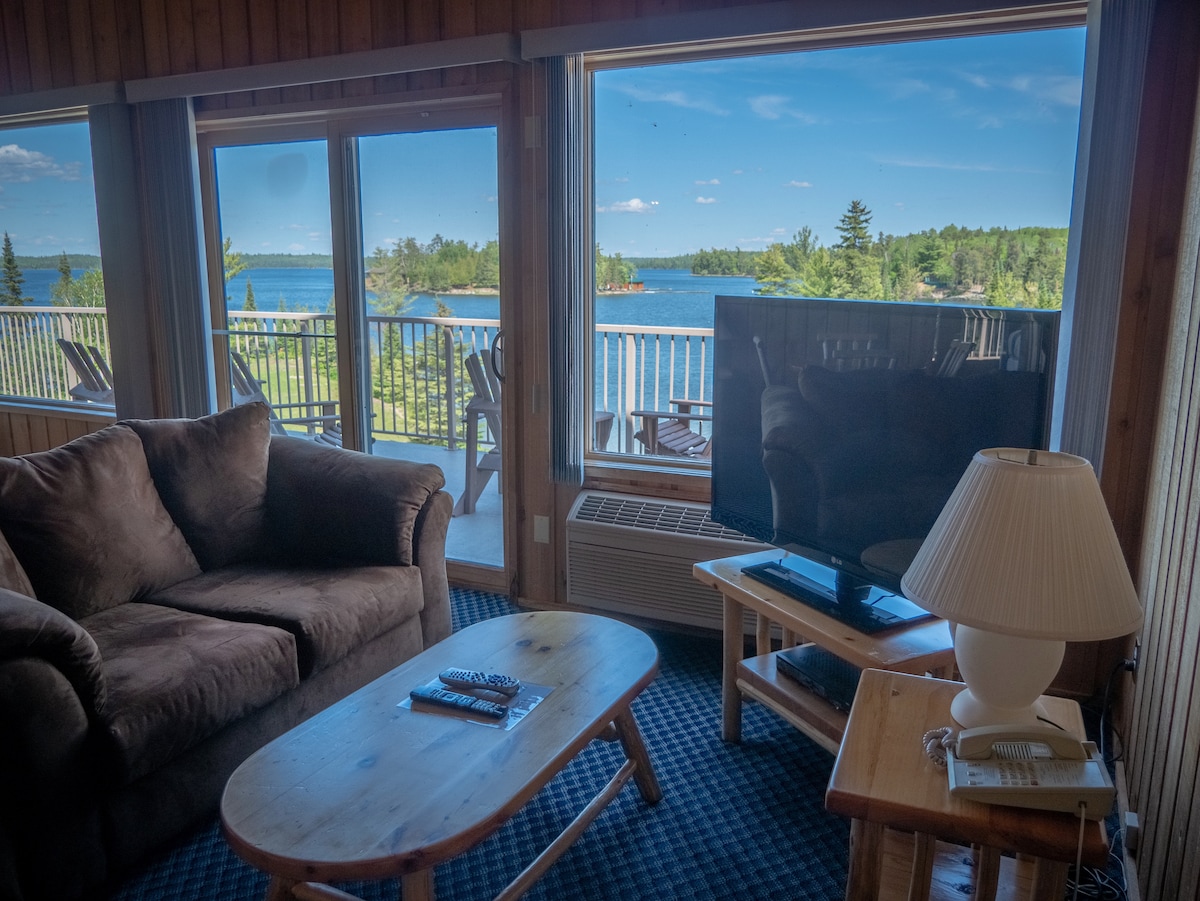 Our Yellowbird Lodge Main Lodge accommodations there are 10 private rooms all connected by a hallway, each with private bathroom, satellite TV, air conditioning, microwave, keurig style coffee maker and mini fridge, as well as sitting area. There is a spacious downstairs lounge area, complete with fireplace, and tv. We are surrounded by white sand beaches and the most beautiful scenery in all of Lake of the Woods!