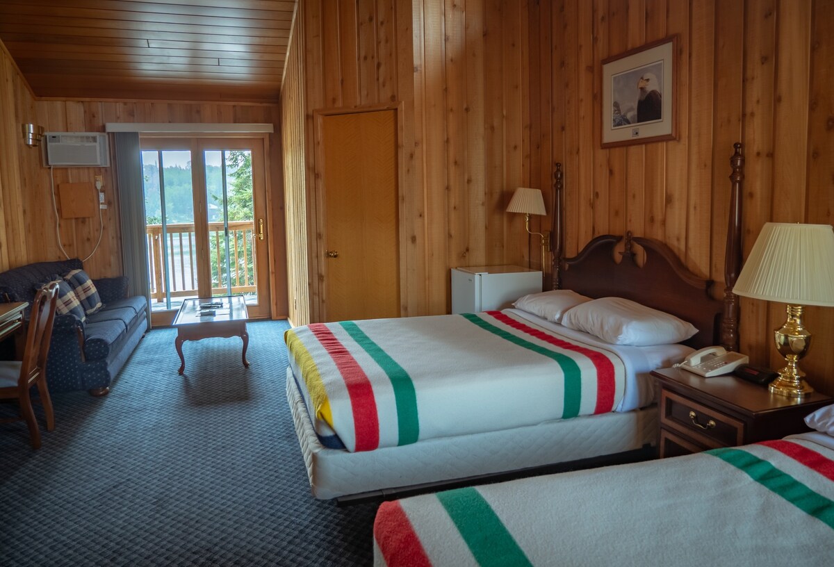 Shared Sauna, Hot Tub, Lakeview, Motel room, 2 Double memory foam mattress, full kitchen, full bath, air conditioning, WiFi, Sat TV. Breakfast 7-9 am