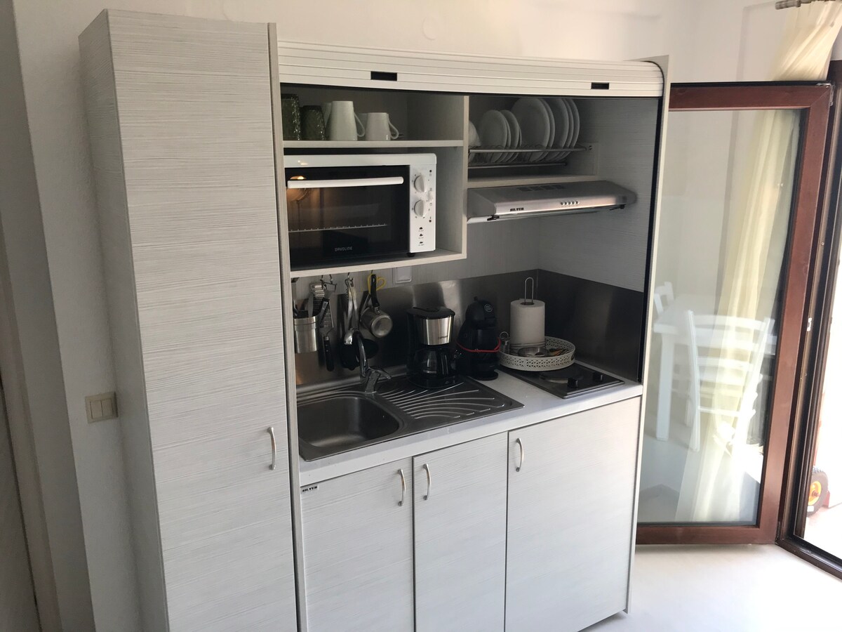 Šis 25 kv. m aukštesnės klasės butas siūlo erdvią ir patogią viešnagę, puikiai tinkančią tiems, kurie ieško tiek atsipalaidavimo, tiek praktiškumo. Jame yra jauki dvigulė lova ir papildoma sulankstoma lova, suteikianti lankstumo jūsų miegojimo sąlygoms. Bute taip pat yra modernus vonios kambarys ir virtuvėlė, kurioje galėsite patys ruošti maistą. Išeikite į didelį balkoną ir mėgaukitės nuostabiu baseinu ir sodo vaizdu, idealiai tinkančiu atsipalaiduoti po ilgos dienos.