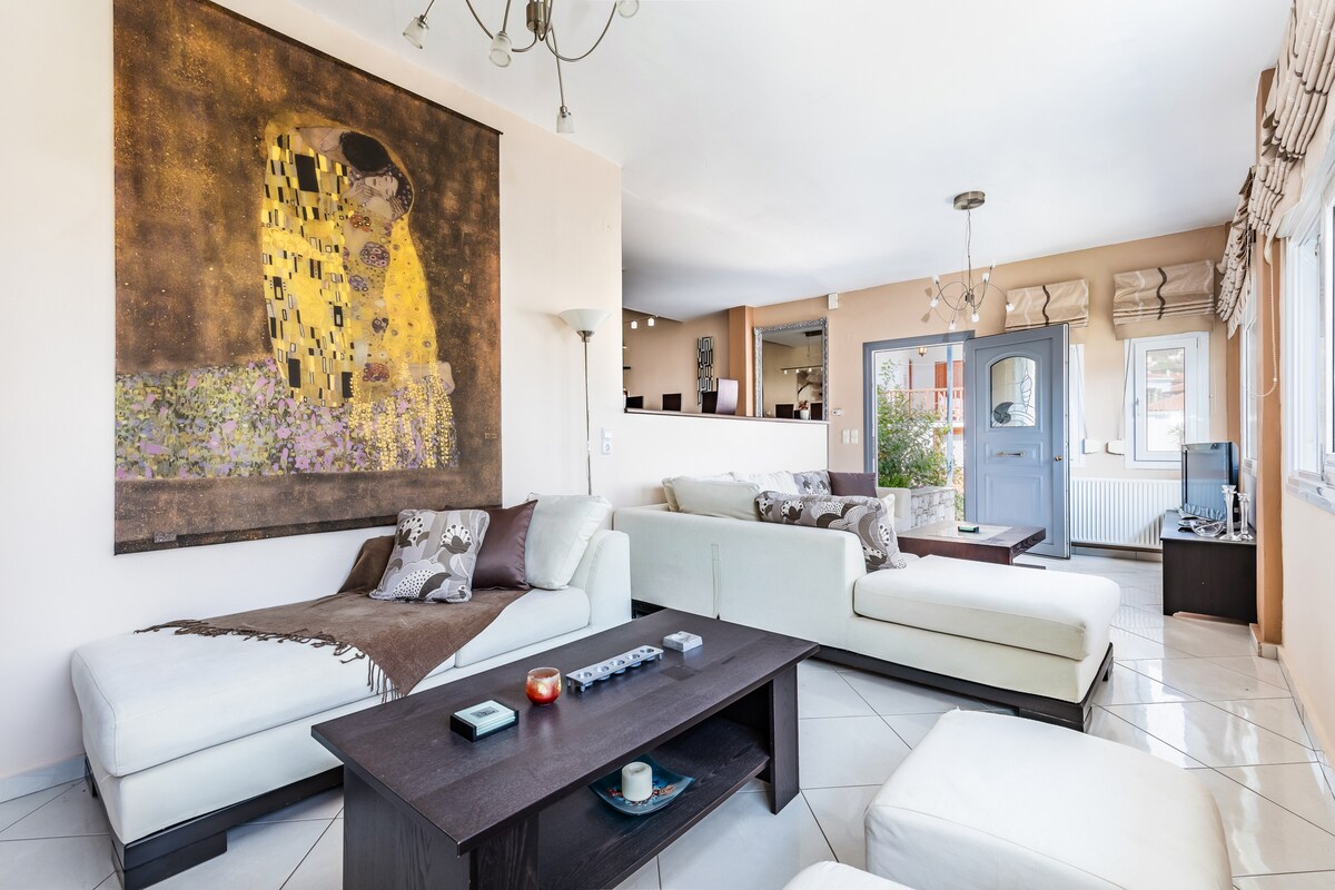 Stilingai rekonstruotas kaimo namas, įsikūręs pačioje Skopelos miesto širdyje. Šiame šviesiame, erdviame būste yra stogo terasa, iš kurios atsiveria panoraminiai vaizdai į kaimą, Palouki kalną, uostą ir Alonnissos salą. Namas yra tarp gyvybingų alėjų, kuriuose gausu parduotuvių, kavinių, barų, kepyklų ir restoranų. Uostas su tavernomis, kavinėmis ir gyvybingu, bet raminančiu naktiniu gyvenimu yra vos už kelių metrų.