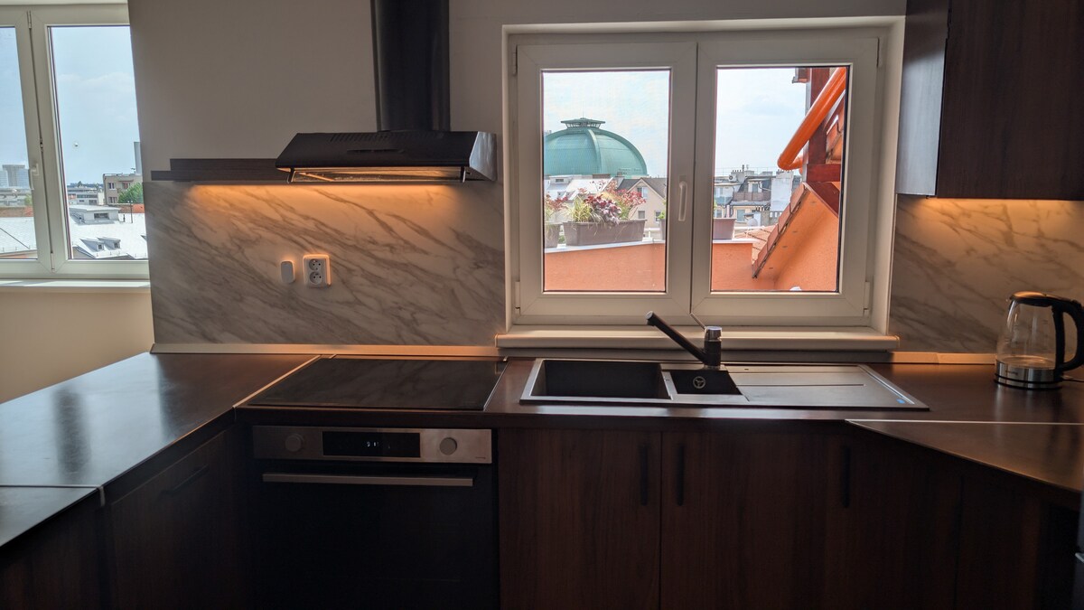 malt & monarch: Discover your urban retreat! A stunning rooftop apartment with a unique terrace view of the historic brewery and Bratislava Castle. Explore amazing coffee shops and restaurants, all within a vibrant neighborhood and walking distance from the city center. Experience Bratislava from a new perspective.