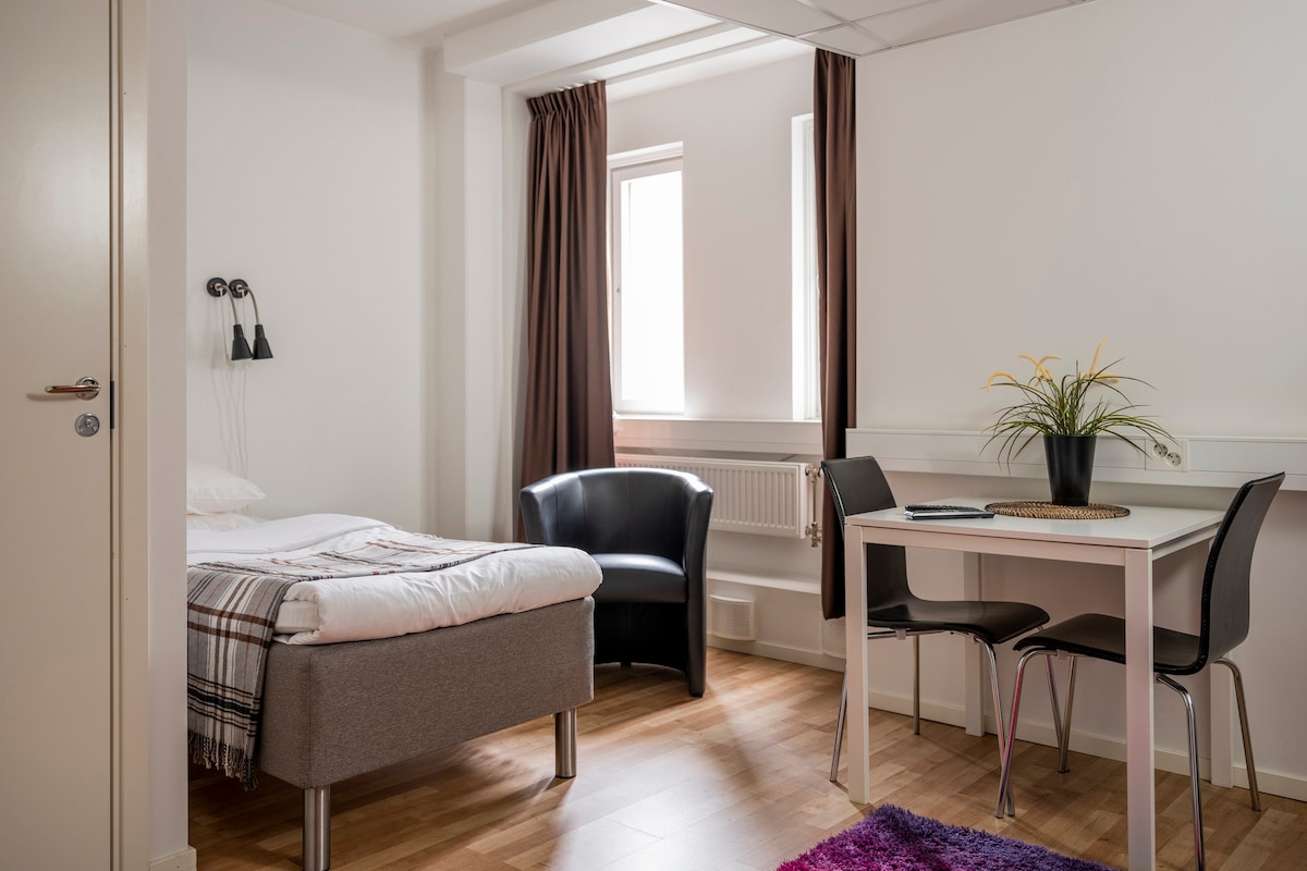 Vienos lovos studijos tipo bute yra 90 cm lova, fotelis, spintos ir stalas su dviem kėdėmis kambaryje. Jame yra privatus vonios kambarys su dušu ir pilnai įrengta virtuvėlė. Yra nemokamas belaidis internetas, galimybė naudotis bendromis skalbimo mašinomis ir sporto salė.