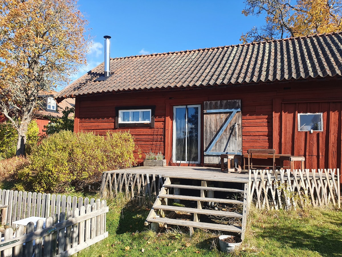 Traditionell svensk stuga på sjötomt - med roddbåt