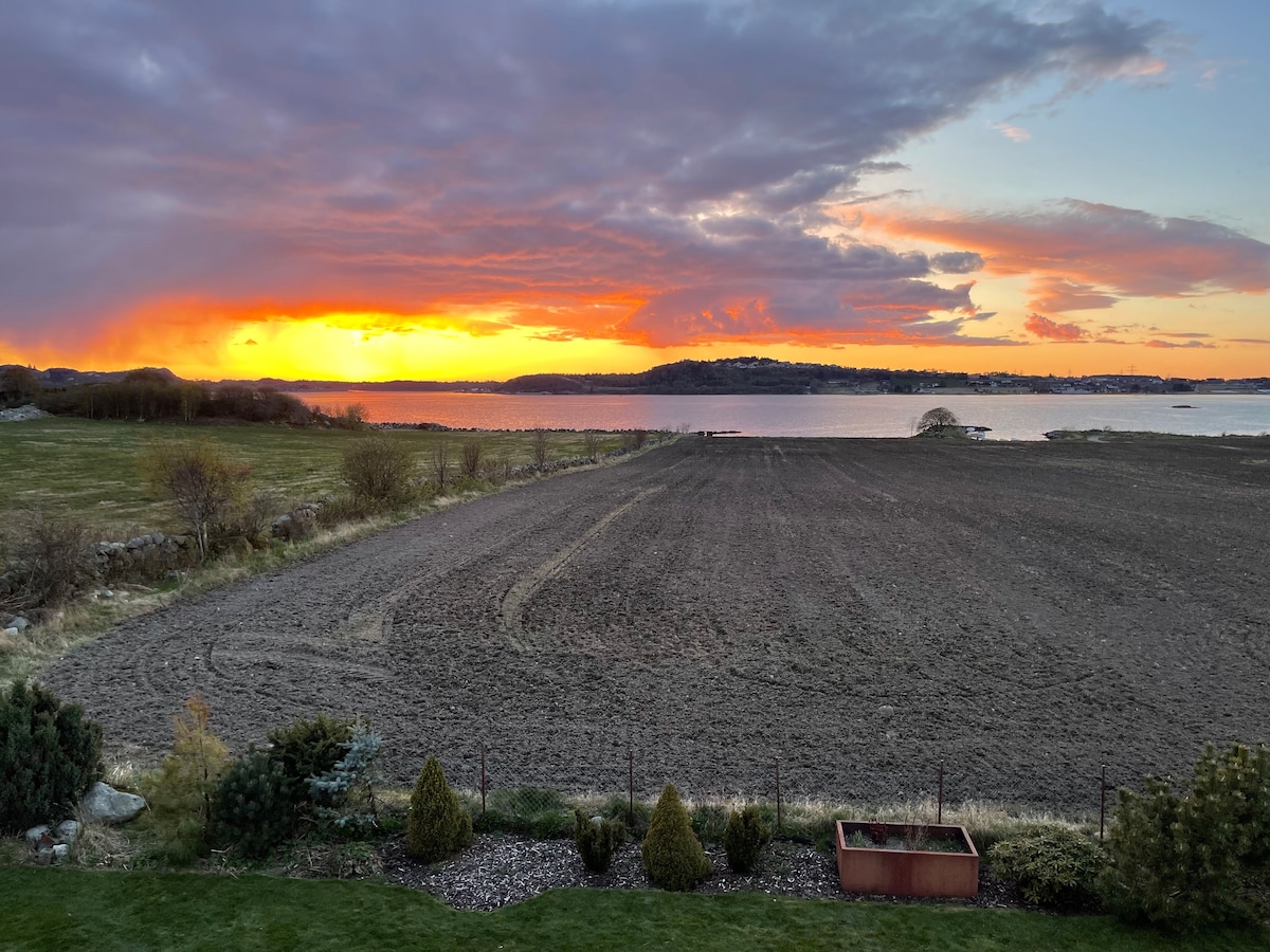 Sodininko butas su automobilių stovėjimo aikštele ir vaizdu į fjordą.