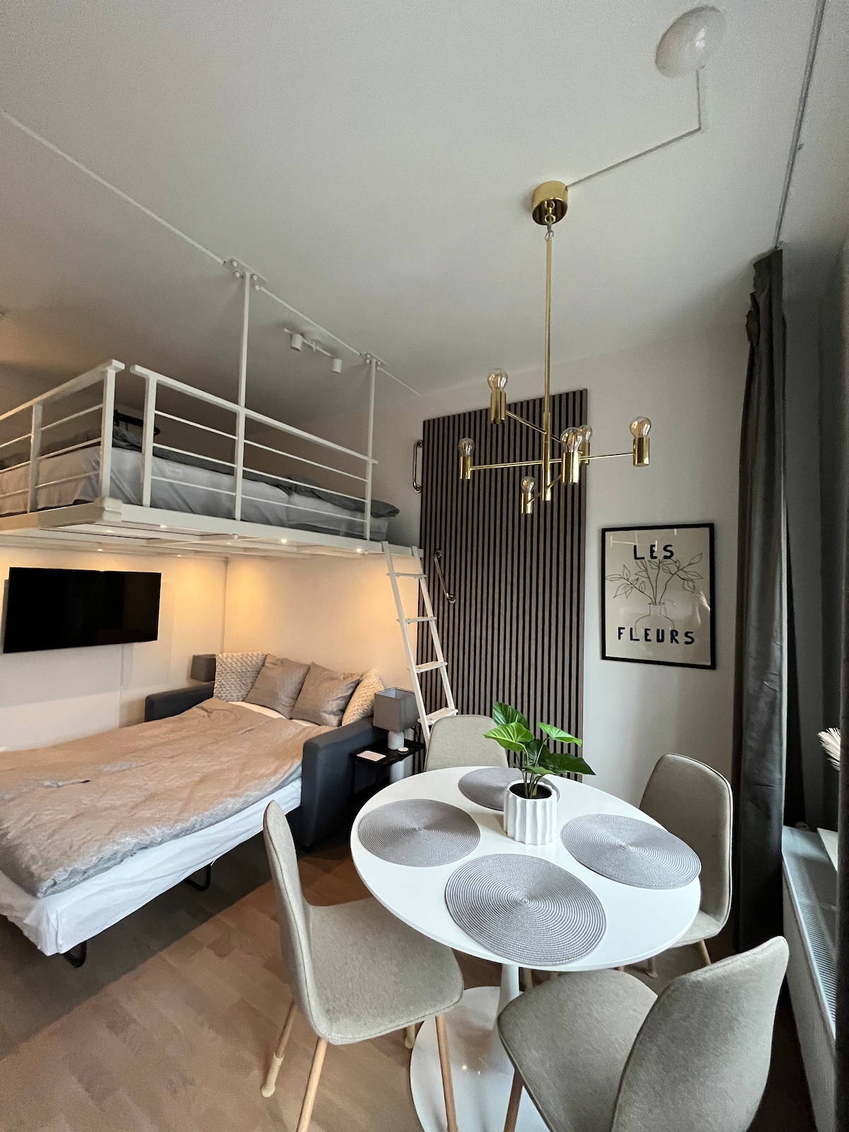 Visiškai nauja skandinaviško dizaino studija Solnoje, 5 min. nuo metro ir 8 min. iki Stokholmo miesto. 26 m² ploto erdvėje yra specialiai įrengtas loftas su didele dvigule lova (220x200 cm), kuri sukuria jaukią miegamąją zoną ir maksimaliai padidina gyvenamąją erdvę apačioje. Sofa paverčiama lova, kurioje gali miegoti iki keturių svečių. Pilnai įrengta virtuvė, modernus vonios kambarys su dušu ir skalbimo mašina, greitas Wi-Fi ir Samsung Smart TV – idealiai tinka poroms, verslo keliautojams arba ramiai viešnagei mieste.