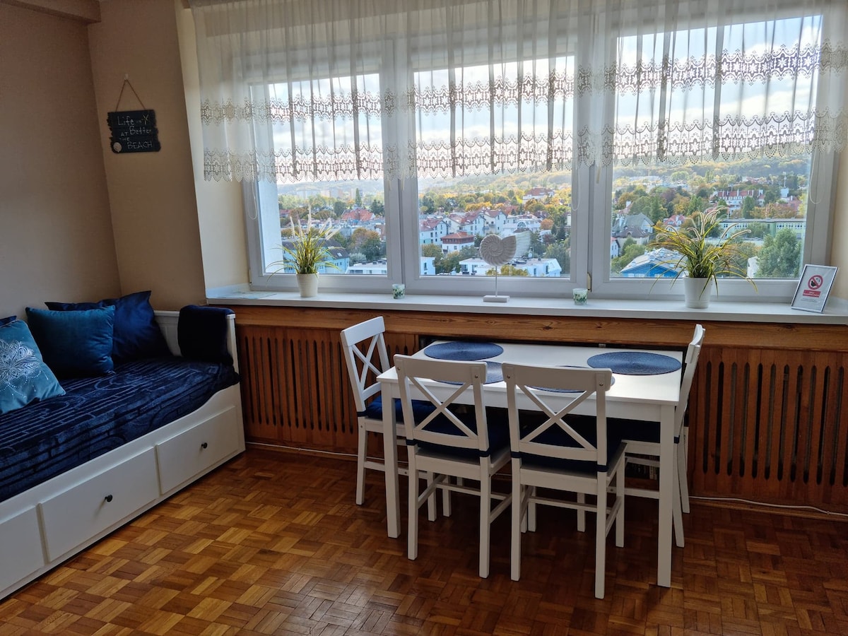 Butas yra Sopote, gražioje vietoje, 200 metrų nuo paplūdimio, 10 minučių nuo Sopoto centro. Butas yra 11 aukštų pastato viršutiniame aukšte - iš jo atsiveria nuostabūs miesto vaizdai! Aplinka ir butas yra ramūs. Be to, netoliese yra parduotuvių, paslaugų įstaigų ir viešojo transporto stotelės. Puiki vieta žmonėms, atvykstantiems į koncertus „Ergo Arena“ - 10 minučių pėsčiomis. Prie namo yra mokamos automobilių stovėjimo vietos gatvėje.