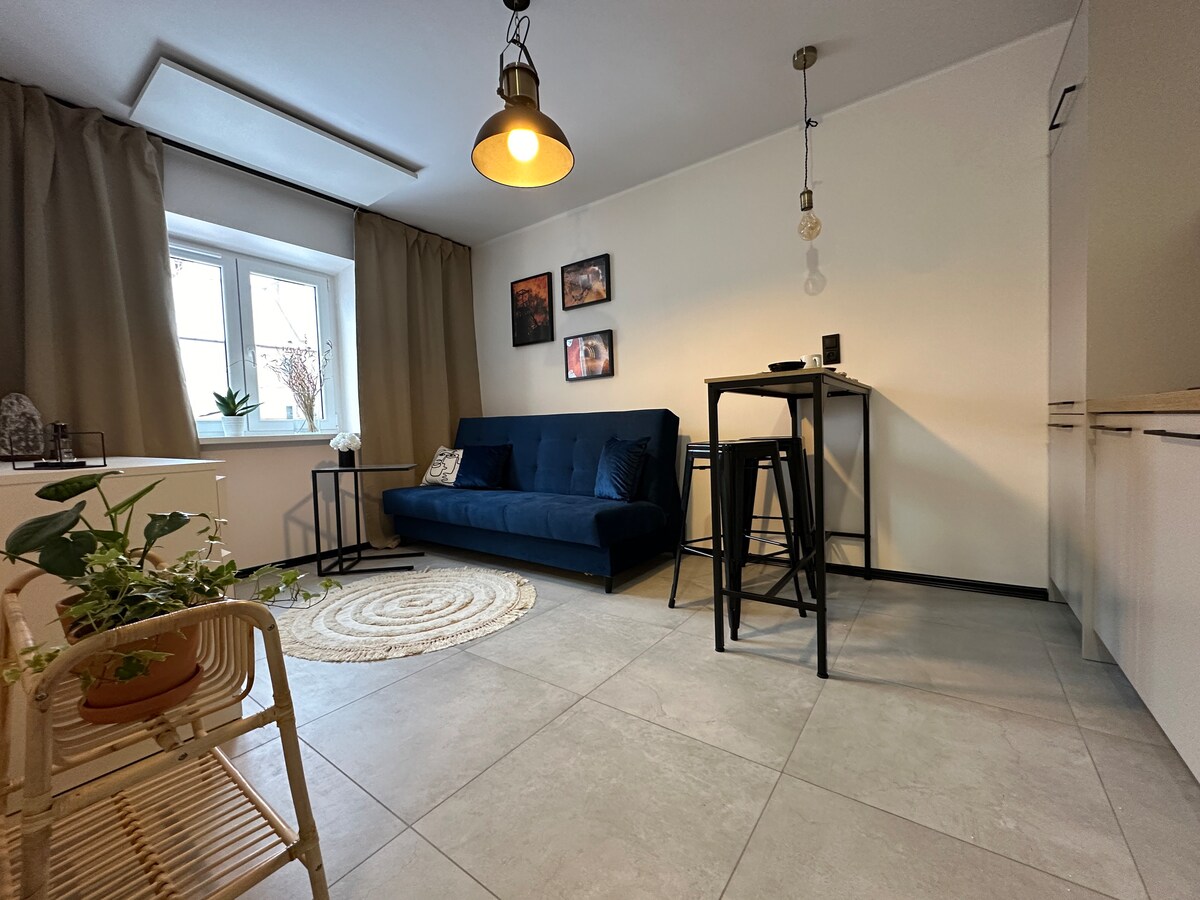 Elegantiška studija su oro kondicionieriumi naujame rajone netoli Oftalmologijos klinikos, Kosciuszko parko, A4 maršruto ir Katovicų centro. Gerai įrengta virtuvė. Skalbyklė, šaldytuvas, orkaitė, Wi-Fi. Vieta pasistatyti automobilį požeminiame garaže (maks. 2 m).