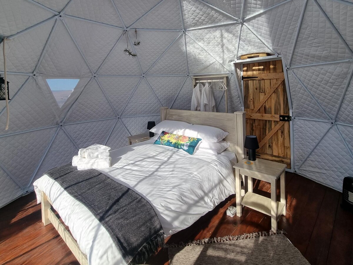 Elegantiškas kupolinis glempingas saugioje Camdeboo Conservancy, už 25 min. kelio automobiliu nuo istorinio Graaff-Reinet miesto Karoo. Šis Camdeboo slėnis yra tylos, ramybės ir erdvės vieta. Vaizdai amžinai. Lengvas privažiavimo kelias, nereikia 4x4 transporto priemonės. Vaikai laukiami paprašius, du vaikai gali būti apgyvendinti ant sulankstomų stovyklavimo čiužinių.
