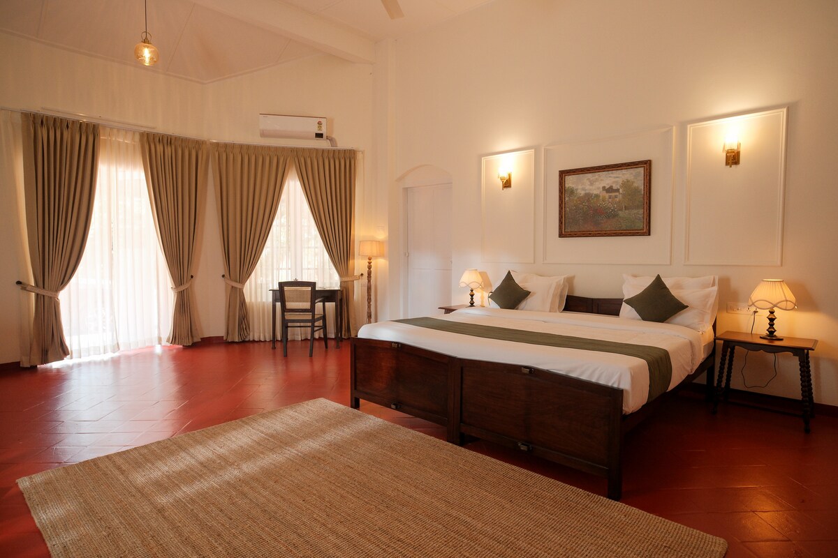 SOL is a spacious room inside Casa Do Leão. our restored 150-year-old Portuguese heritage home in Nerul, North Goa. This listing is for one private ensuite room within the home, not the entire property. Guests share the garden & outdoor spaces with others staying in the house. Featuring a king bed and an additional day bed, SOL accommodates up to three guests. Ideal for small families, friends, or travelers wanting extra space in a peaceful village setting close to Nth Goa’s beaches.