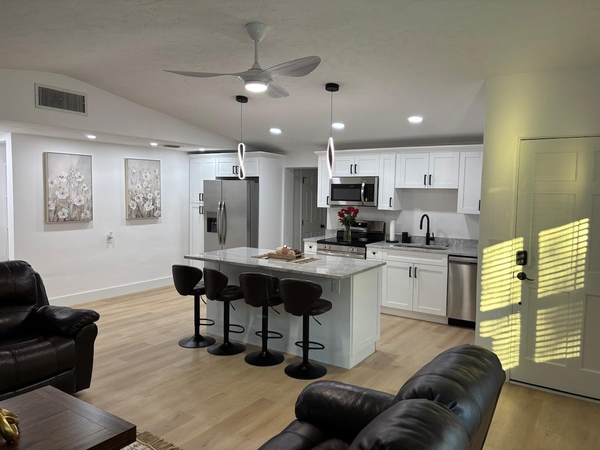 Didelis modernus 950 kv. pėdų 1 kambario butas. Gražiai įrengtas butas, prijungtas prie pagrindinio namo šono. Šiame viršutiniame aukšte yra privatus įėjimas su moderniu interjeru ir aukštomis lubomis. Bute yra 1 karališko dydžio lova, pilnai įrengta virtuvė, vonios kambarys su dušu, skalbimo mašina ir džiovintuvas, 2 televizoriai. Įsikūręs ramioje gatvėje, iš kurios lengvai pasieksite Siesta Key. Įsikūręs už 1 mylios nuo Stickney Point tilto ir lengvai pasiekiamas Siesta Key. Svečias turės užlipti vienu laiptu