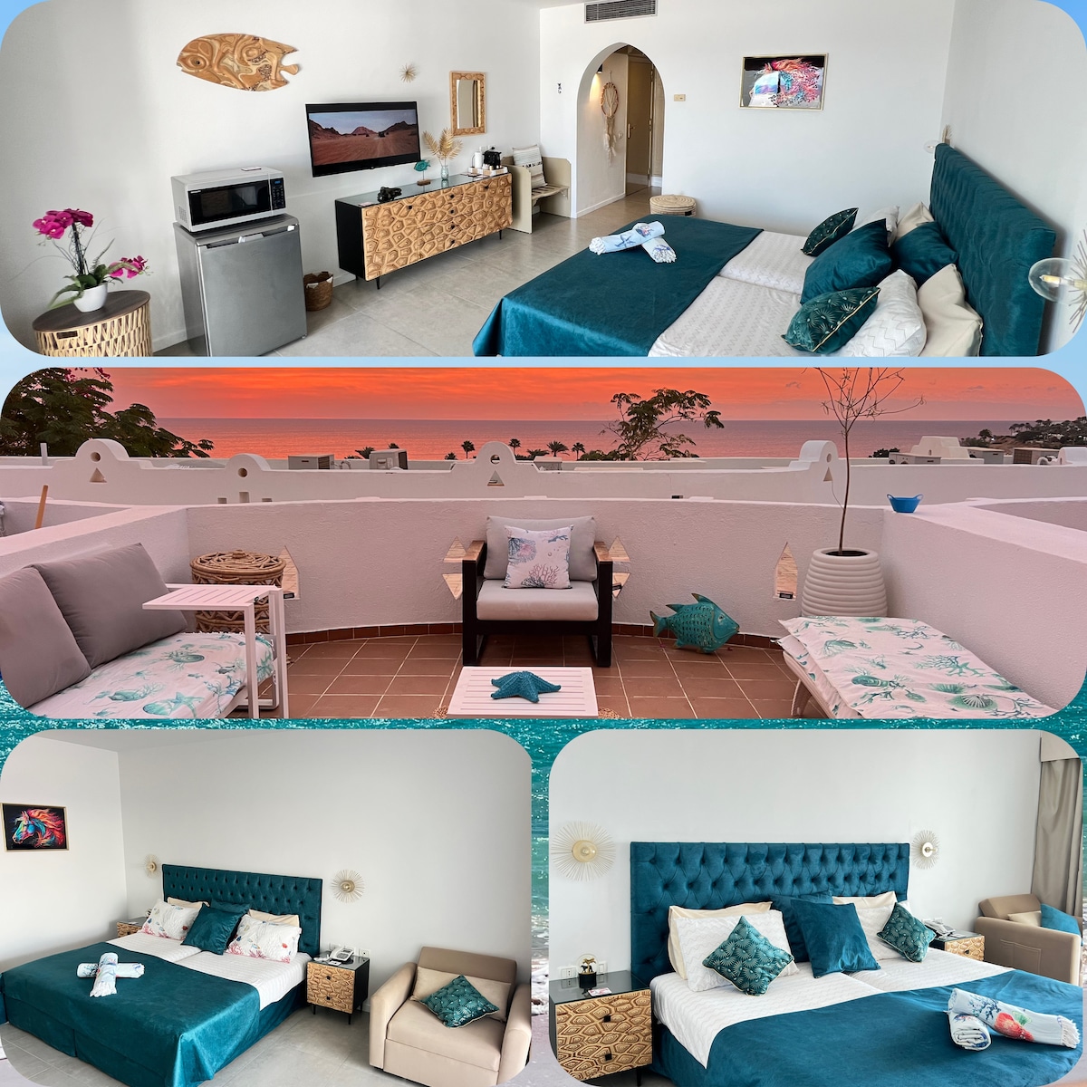 Mėgaukitės šiuo žavingu būstu su kvapą gniaužiančiais vaizdais: iš vienos pusės intensyvia Raudonosios jūros mėlyna spalva, kita vertus, ramiais sūroko ežero vandenimis, apsuptu palmių. Mūsų kambarys 4 svečiams yra prestižiniame Domina Coral Bay Resort kurorte ir jame dera nepriklausomo įėjimo privatumas su visais 5 žvaigždučių viešbučio patogumais. Tai ideali poilsio vieta poroms, šeimoms ar draugams, norintiems sujungti visišką atsipalaidavimą, vandens sportą ir prabangos paslaugas už mažą kainą