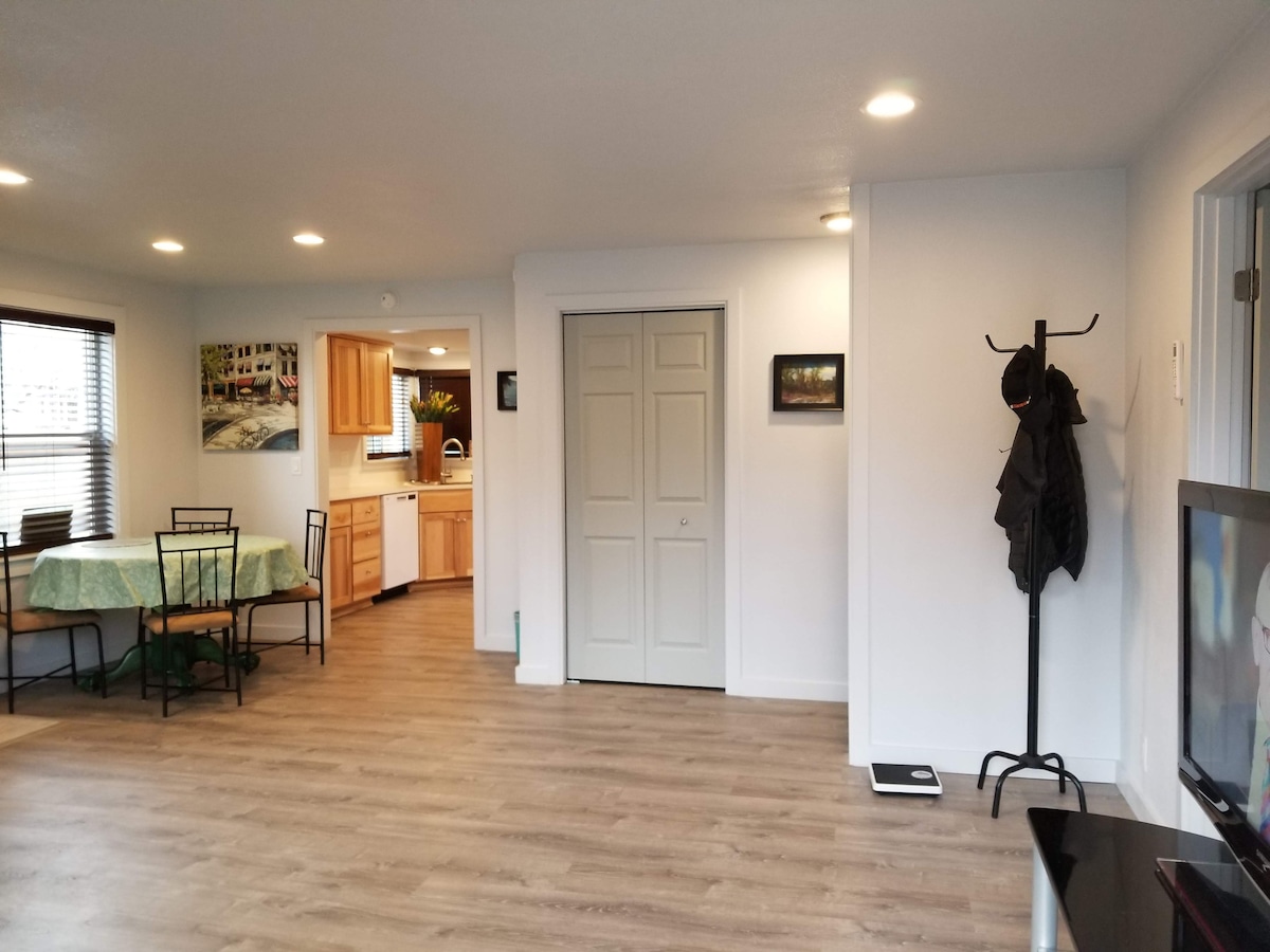 Linksmas kotedžas yra žavingi, žėrinčiai švarūs namai su kietmedžio ąžuolo grindimis; pilnai įrengta virtuvė; skoningi ir patogūs baldai bei daug meno! Sūkurinė vonia yra gerai prižiūrima ir yra tiesiai už kotedžo šalia pritvirtinto denio, kad būtų lengva pasiekti. Kitoje gatvės pusėje yra gražus parkas ir poilsio centras su vidaus baseinu ir sauna. Esate už 10 minučių kelio nuo oro uosto, už kvartalų nuo dviračių tako palei upę ir už kelių mylių iki prekybos centrų ir Eugenijaus miesto centro.