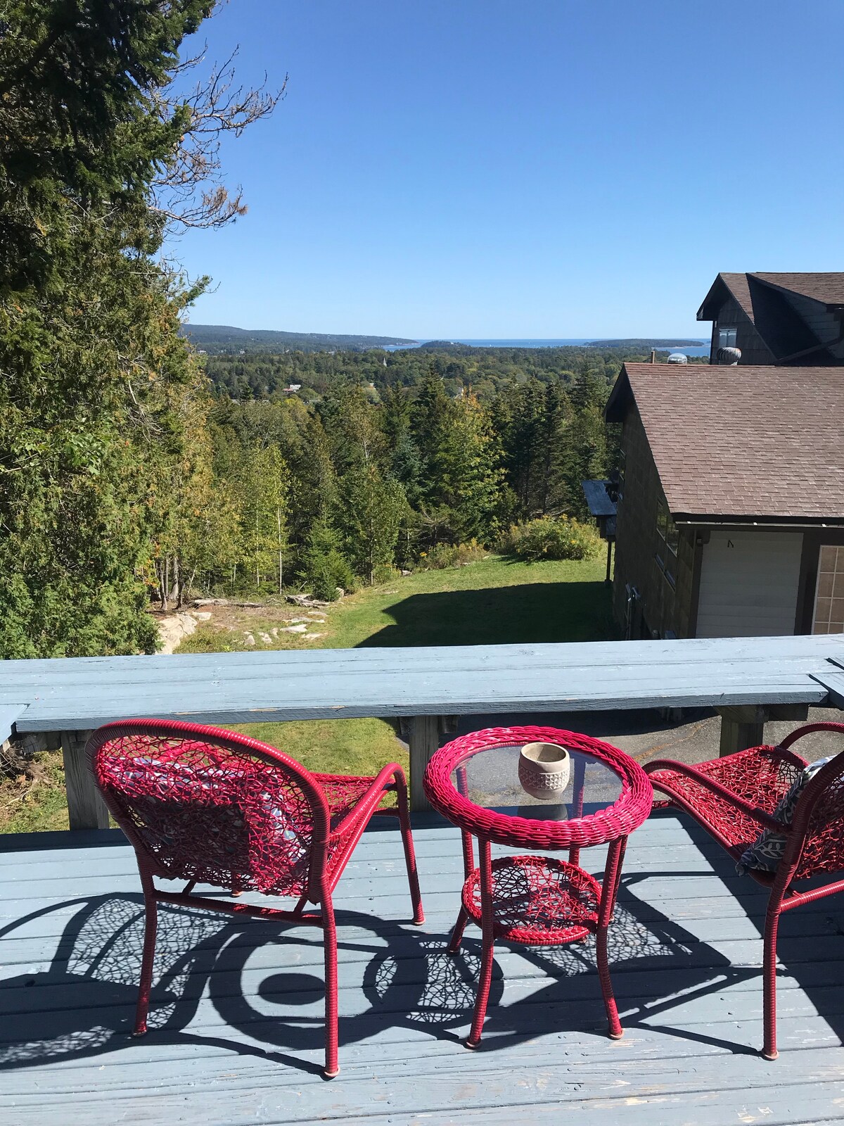 Paukščio lizdas - tai aukštesnio lygio butas su vaizdu į Somes Sound, Pietvakarių uostą ir Akeidijos kalnus. Yra nedidelė virtuvė ir saulėta antro aukšto terasa, kurioje galėsite mėgautis vaizdu ramiais pusryčiais ar vakariniu maistu. Nors būstas yra nuošalus ir privatus, mes turime savo privatų miško taką, kuris nusileidžia tiesiai į miestą, kur galite mėgautis Pietvakarių uosto restoranais ir parduotuvėmis arba gaudyti nemokamą salos Explorer autobusą.