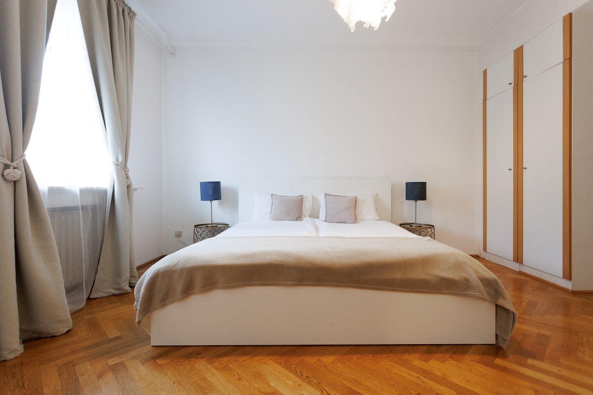 Ryškus, gražus ir tylus butas centre - viršuje! Du kambariai. Dvi lovos (viena didelė labai patogi dvigulė lova, o kita - labai patogi tinkama viengulė lova). Internetas. Rankšluosčiai. Labai švarūs. Puikiai tinka poroms, draugams ir verslininkams. Butas yra pirmame aukšte (arba antrame aukšte, jei pirmąjį laikote pirmuoju - ne pirmame aukšte!) ir yra liftas.