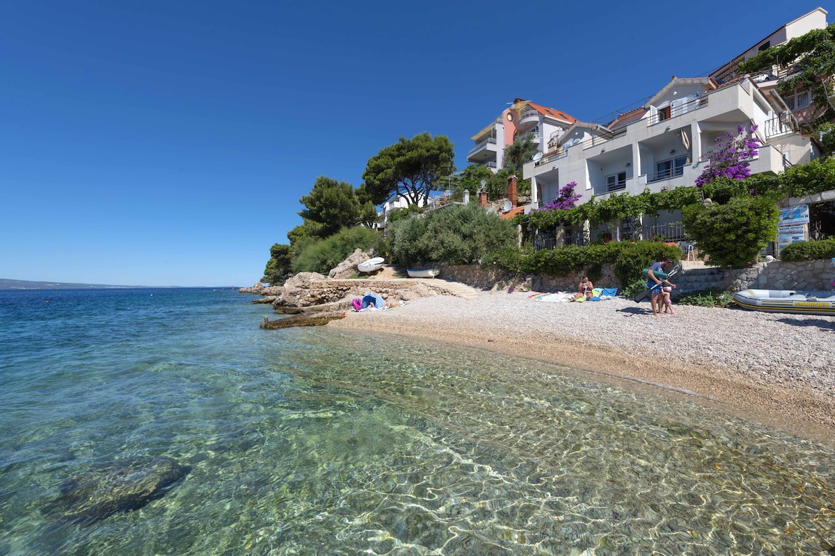 Didelis modernus butas su 2 didelėmis terasomis, saulės dušu, 2 įėjimais, 2 vonios kambariais, veranda, vaizdu į jūrą, sodu, Wi-Fi, didele virtuve. Butas yra patogus ir tik 50 m nuo jūros. Didelis vonios kambarys yra naujas, o mes šiuo metu rekonstruojame didelį rudą kambarį, kuriame taip pat įrengėme antrą oro kondicionierių, kad dabar apartamentuose būtų 2 oro kondicionieriai.