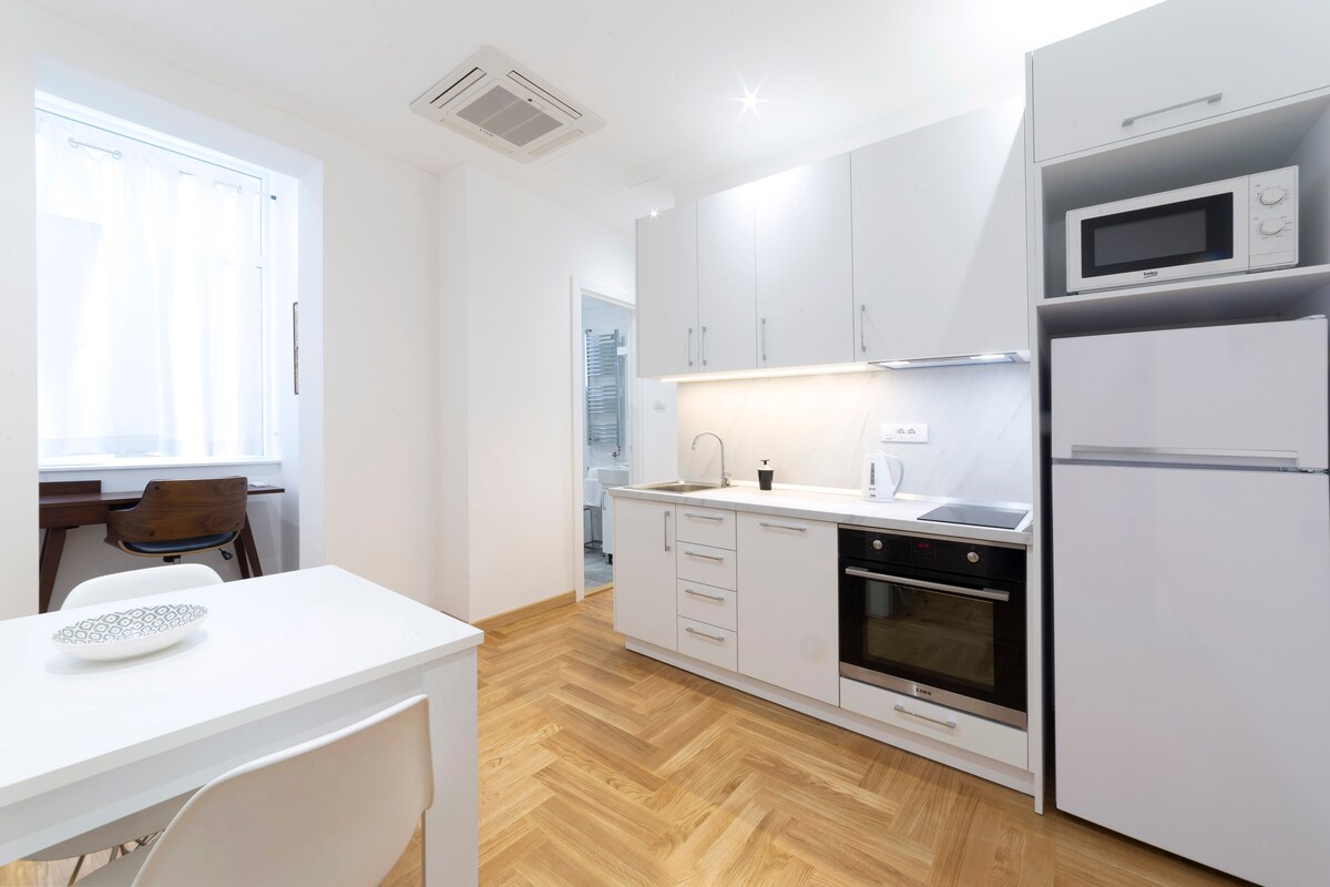 2 miegamųjų butas: pilna virtuvė, oro kondicionierius, darbo vieta, netoli centro