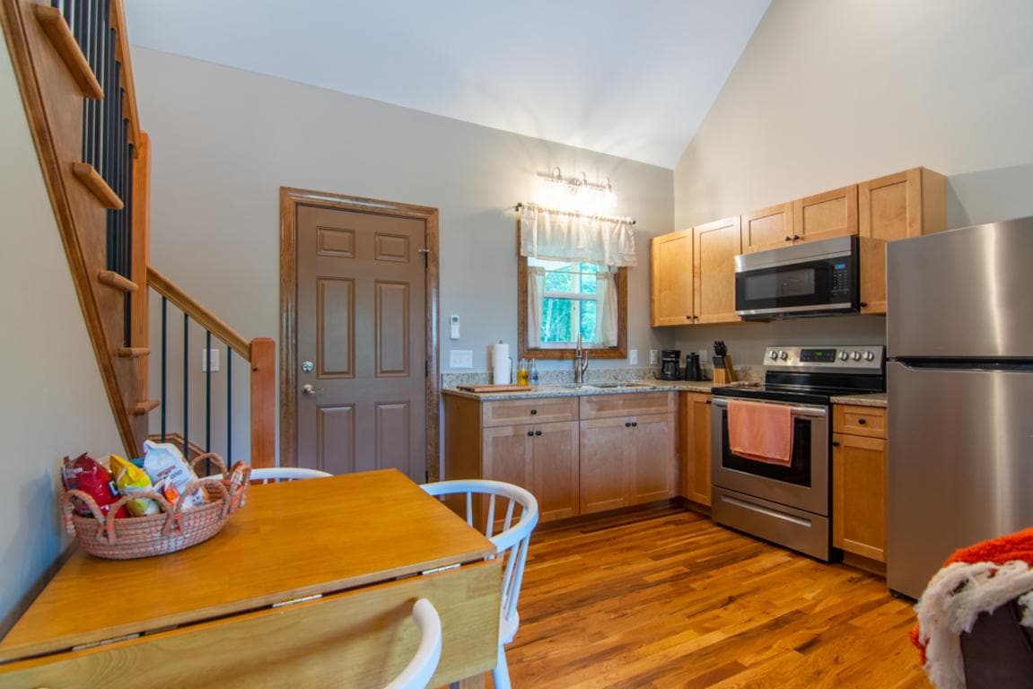 A family heritage 1850 log home that was completely renovated in 2007. The front porch overlooks Stony Knoll vineyard grounds and tasting room which is across the street. This wine lodge consists of 1 full bath with a shower and jacuzzi, 1 double bed, 1 king bed and 1 single bed loft. A fully furnished kitchen for all meal prep. A full sized living room with fireplace and TV. Come and enjoy a glass of wine on the front porch or listen to the rain hit the country tin roof.