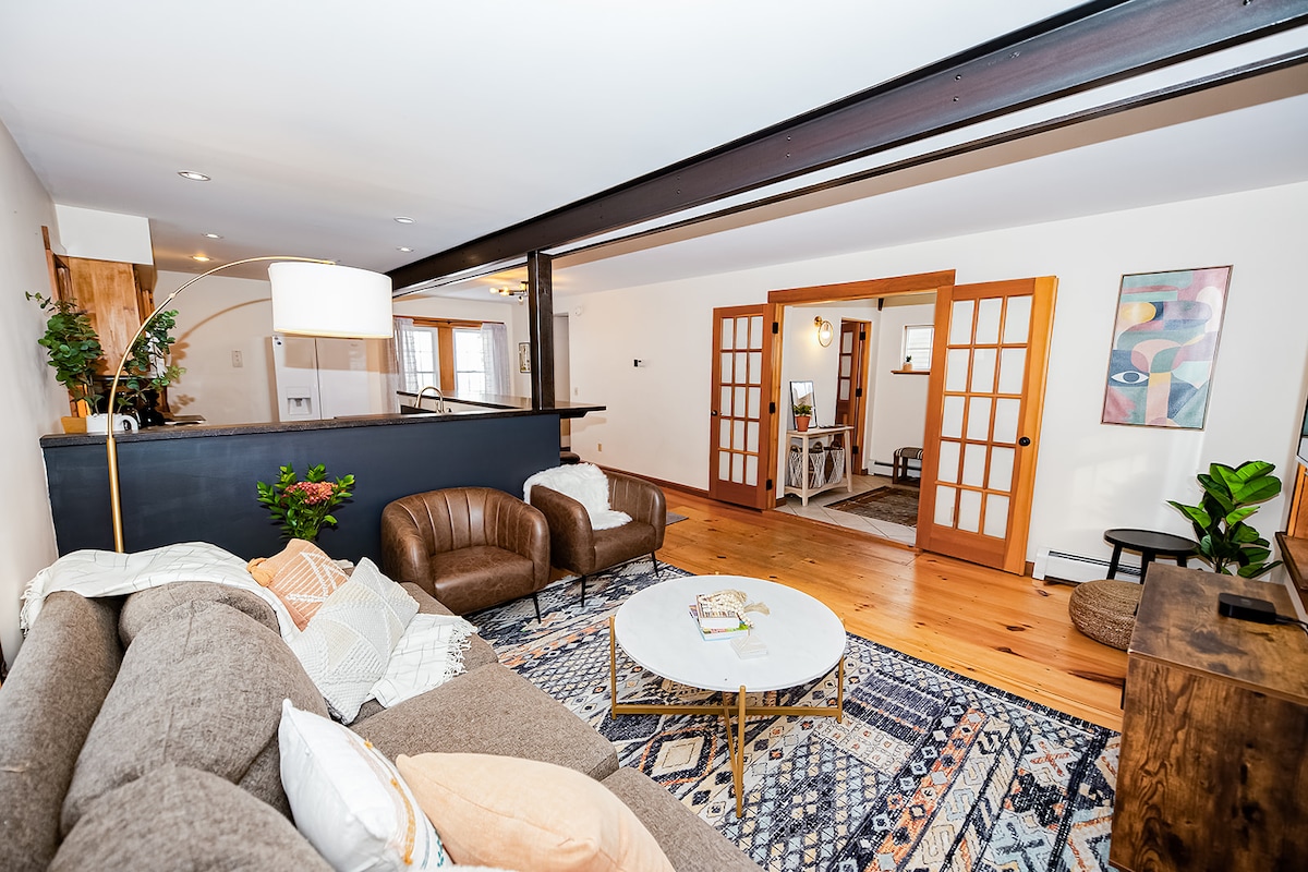 Mielas 2 miegamųjų loftas, tinkamas augintiniams, yra mažiau nei už 1 mylios nuo Stowe kalnų kurorto. PRIVATI SŪKURINĖ VONIA privačiame denyje. Atviro plano svetainė ir valgomasis su pilnai įrengta virtuve. Loftas yra Mtn Rd ir turi atskirą įėjimą. Iki Matterhorn galima nueiti pėsčiomis. Tiesioginis priėjimas prie dviračių tako, daugybės kalnų dviračių ir pėsčiųjų takų. Mtn Rd. maršrutinis autobusas iki namelio sustoja prie mūsų durų. Netoli visko. Greitas 5 G Wi-Fi. Užtamsintos užuolaidos ir oro kondicionierius. Naujas „Samsung“ išmanusis televizorius su transliacijomis.