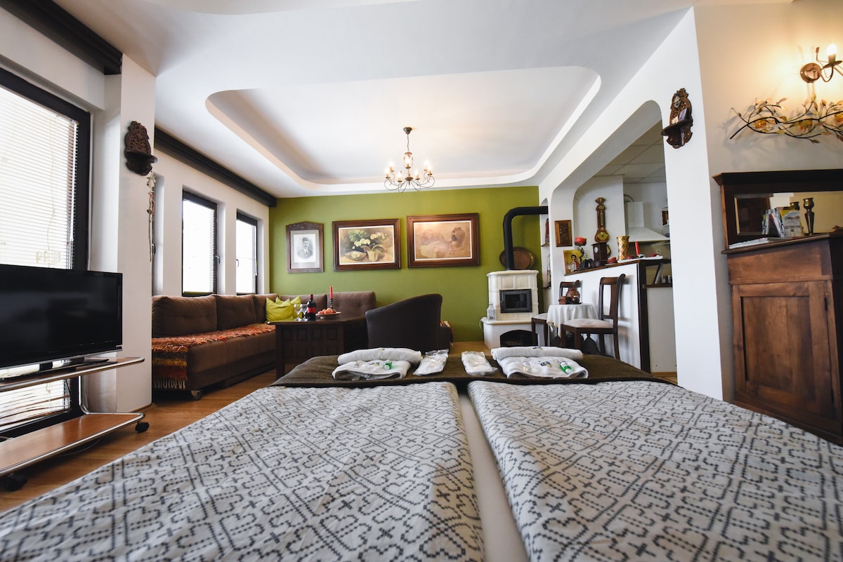 Iš jūsų apartamentų (antrame aukšte), esančiame aukščiausiame Pestani (Ohrido) taške, atsiveria unikalus vaizdas į Ohrido ežerą ir Galicikos kalną. Apsupti žalumos ir gamtos gausos, galite mėgautis vienoje iš 5 terasų su vaizdu į ežerą ar kalną arba tiesiog sėdėti sode prie fontano ir klausytis upės garso. Savo liukso numeryje yra 2 miegamieji, 1 svetainė, visa įranga, virtuvė, vonios kambarys, tualetas, uždara terasa su ugnimi ir didžiuliu žaliu sodu.