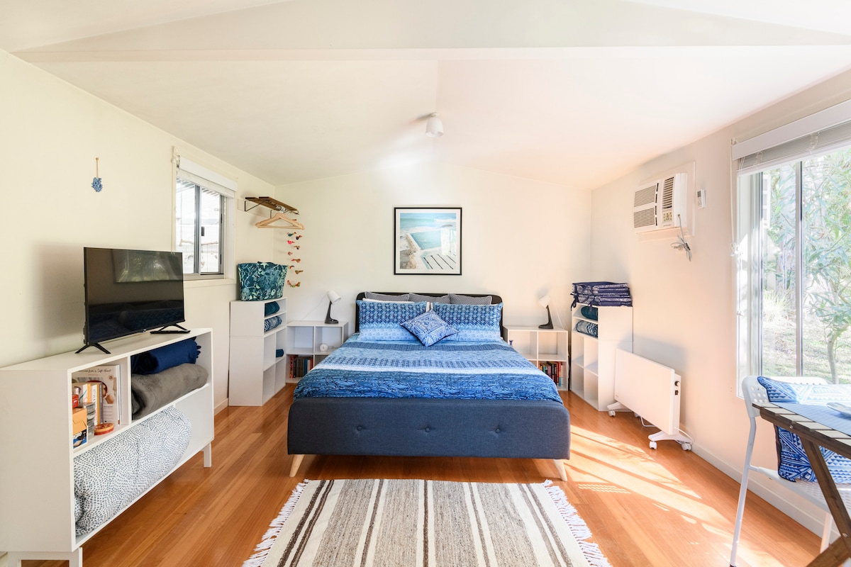 Jums patiks mano namai vos už 7 minučių kelio pėsčiomis nuo Cookies paplūdimio, Murramarang nacionalinio parko pasivaikščiojimų ir Murramarang kurorto. Turėsite savo ramią studijos tipo trobelę, apsuptą sodų ir krūmų. Į kainą įskaičiuota patalynė, vonios ir paplūdimio rankšluosčiai, Wi-Fi ir transliacija. Vonios kambarys yra lauke, bet uždaras ir privatus! Yra pilnai įrengta virtuvė, automobilių stovėjimo aikštelė ir maža, šešėliuota terasa su vaizdu į sodą. Kam mokėti daugiau už erdvę, kurios jums nereikia?