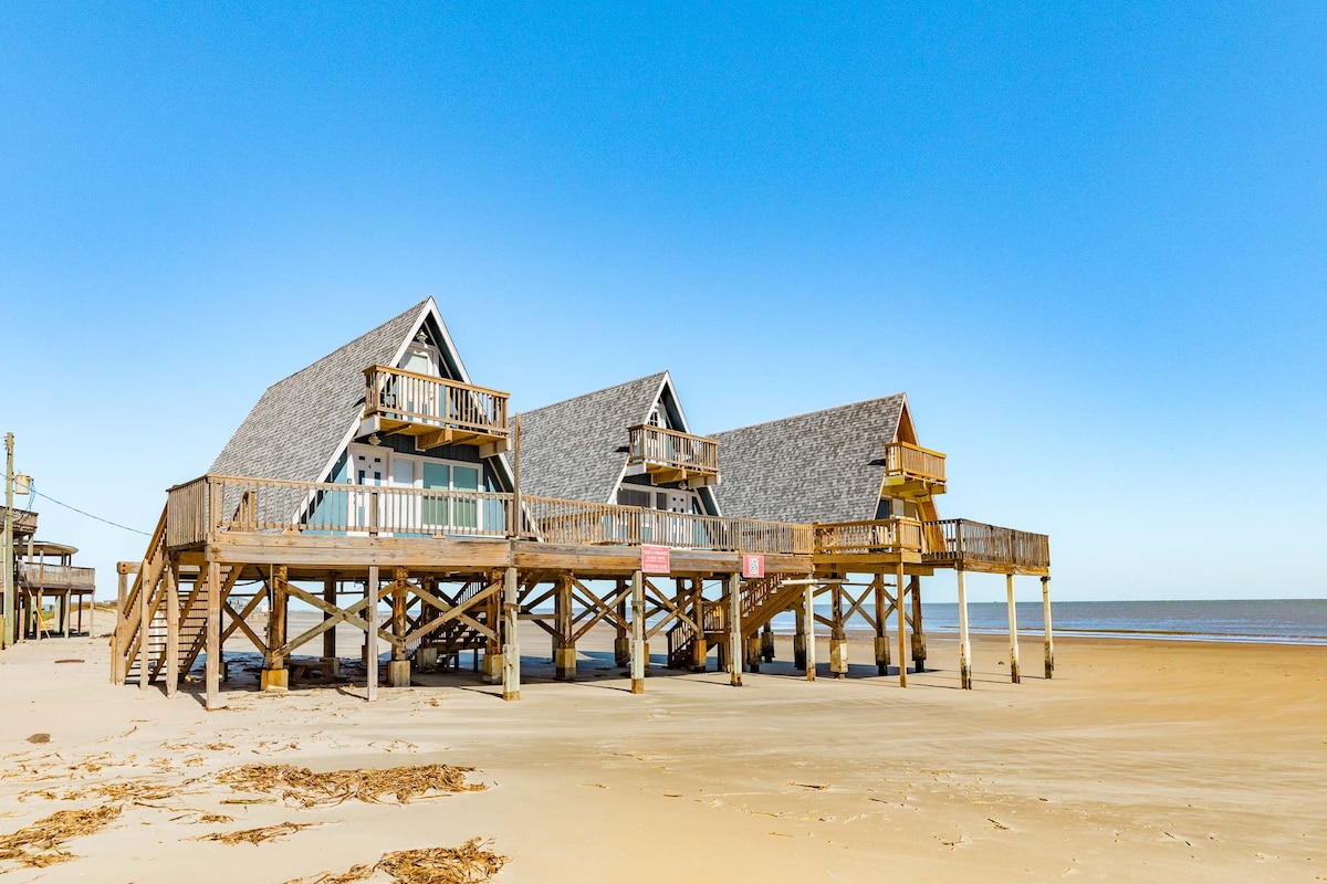 NEW Beachfront Construction! Truly a Unicorn:🦄 LOCATION, LUXURY, and So Nice to Have NEW! Located steps away from the best restaurants and beach in Surfside! Enjoy hammocks and games under the house. Climb the steps to an awesome shaded deck with views from San Luis Pass all the way to the Jetty! More than 180 degree unobstructed views. Bedrooms open to SunDeck and stargazing with fire 🔥 pit YouTube Beachfront Luxe for video $125 cleaning fee and only $75 total for up to 2 pets for whole stay!