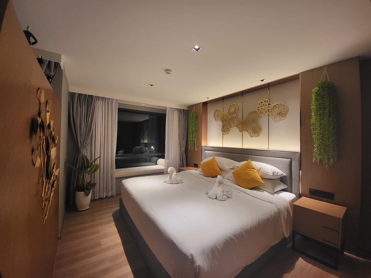Pabėkite į savo privatų prieglobstį su vaizdu į jūrą Mida Grande Resort Phuket, kuriame yra prabangi 6 pėdų lova, vandenyne pabučiuotas balkonas, skalbimo mašina ir privatus vonios kambarys. Mėgaukitės modernia sporto sale, gaivinančiais baseinais ir puikia vieta vos už 1,1 km nuo Surino paplūdimio - netoli valgyklų ir parduotuvių. Puikiai tinka trumpiems pabėgimams ar ilgesnėms viešnagėms, jis sklandžiai sujungia komfortą, patogumą ir kvapą gniaužiantį pakrantės žavesį.
