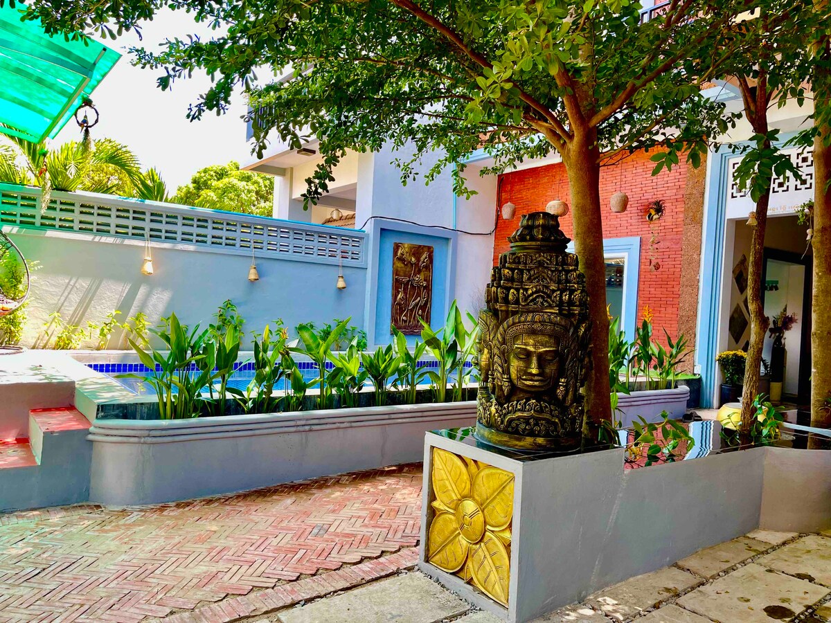 Mudita vila puikiai tinka šeimai ar draugų grupei, kurioje yra 5 dideli miegamieji, 2 svetainės ir sodas. Tai graži vieta, švari, saugi rajono zona, įsikūrusi vos už 5 minučių kelio pėsčiomis iki Pub gatvės, naktinio turgaus, Karališkųjų rūmų ir Angkor muziejaus. Tai khmerų ir vakarietiško stiliaus bei pilnai įrengta virtuvė su nemokamu belaidžiu internetu. Už 7 minučių kelio automobiliu Angkor Wat. Atsipalaiduokite ir mėgaukitės privačiu baseinu po varginančios ekskursijos po šventyklą dienos.