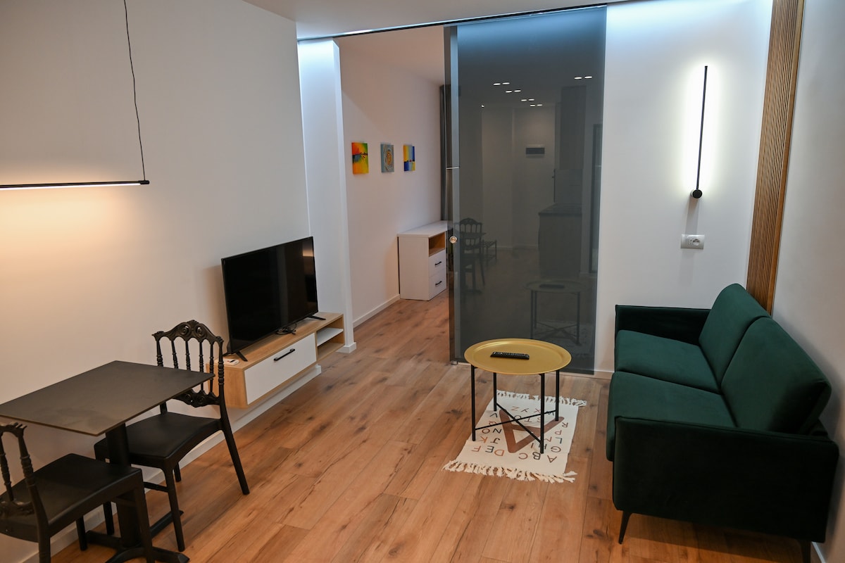 Mūsų prašmatni studija yra stilinga poilsio vieta visiems. Vos už 2 minučių kelio pėsčiomis iki miesto centro, Bllok ir pagrindinio bulvaro, vieta yra ideali. Šiuolaikinis interjeras suteikia paprastumo ir komforto jausmą su gerai įrengta virtuve, jaukia lova, moderniu vonios kambariu, skalbykle ir džiovykle. Nesvarbu, ar tyrinėjate Tiraną, ar mėgaujatės ramia naktimi, ši studija yra puikus pasirinkimas! Vienas iš dviejų gretimų butų tame pačiame aukšte – patikrinkite „Boutique Flat“, ar yra laisvų vietų. Apsilankykite: airbnb.com/h/boutiquetr