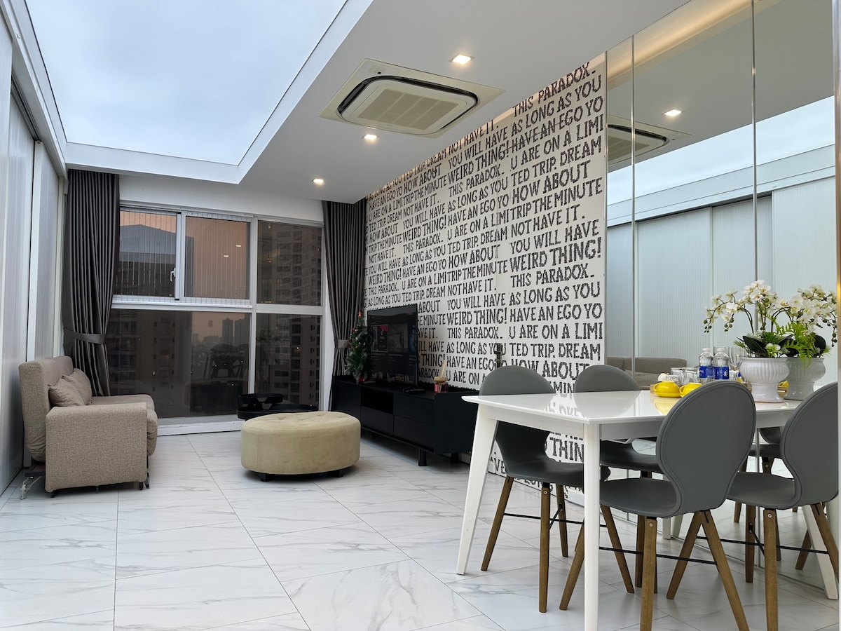 Erdvus dvipusis | 4 patogūs miegamieji | Privatus baseinas ant stogo HORIZONTO ROJUS Mūsų namuose yra 2 aukštų apartamentai, kuriuose patogiai gali apsistoti iki 8 svečių ir vaikų. Jame yra atskiras įėjimas, baseinas, sodas ir virtuvė, kuria galite mėgautis. Dvipusis namas, esantis ramiame, prabangiame rajone 7 rajone, yra pastate, kuriame yra tik 1 kitas butas. Išeikite į ramų parką ir vaizdingą ekologinį ežerą. Netoliese rasite įvairių restoranų, kavinių, kurortų ir LOTTE prekybos centrų.