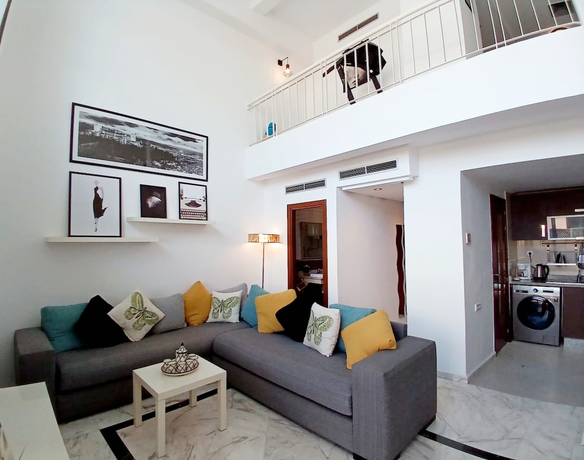 Dvipusis su didele ir gražia terasa Tanžero centre. A/C, išmanusis televizorius, Wi-Fi, automobilio statymas pastate, baseinas pastate, apsauga visą parą. Marmurinės grindys, vaizdas į jūrą iš terasos. Erdvu ir šviesu! Vos už 10 minučių kelio pėsčiomis nuo medinos ir už 15 minučių kelio pėsčiomis nuo paplūdimio