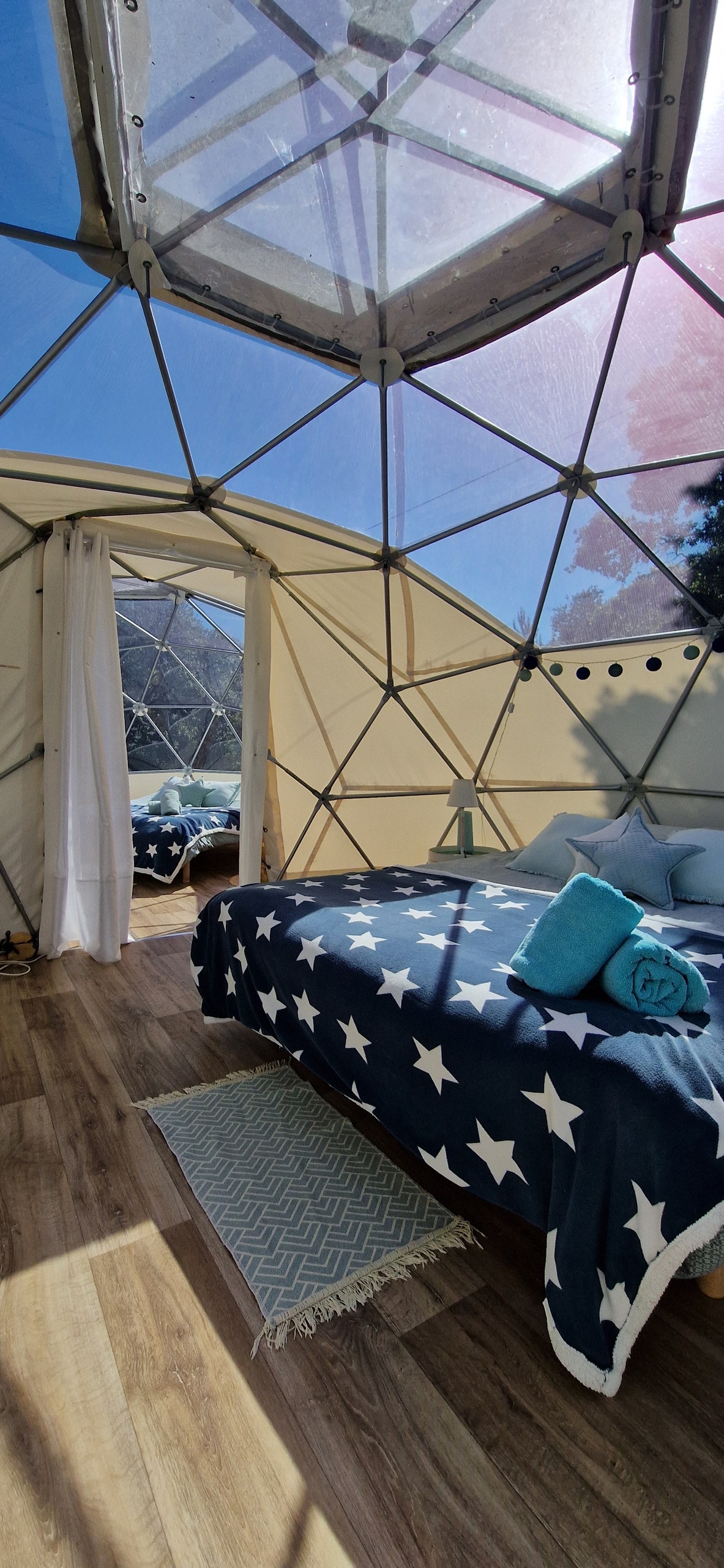 Mūsų geodezinis kupolas yra įdėtas į medžius didelėje 70m2 medinėje terasoje su privačiu SPA. Šis neįprastas kamuoliuko formos būstas pagamintas iš drobės ir medžio. Kupolo paviršiaus plotas yra 30 m2. Jame yra erdvė su panoraminiais kalnų, upelio ir žvaigždėto dangaus vaizdais iš poilsio zonos ir dvigulės lovos, virtuvės zona. Kupolas yra be vonios kambario, bet netoli privačios stovyklavietės sanitarinės zonos (50 metrų).
