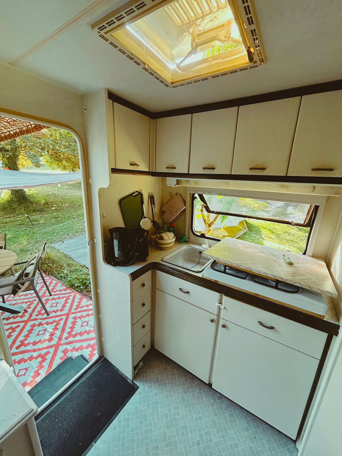Vue imprenable sur le village d'ENTRAYGUES/TRUYERE dans une caravane et son auvent vintage. A l'intérieur de la caravane : petit lit (137/183), gazinière, évier, placard, coin repas. Sous le auvent : coin repas, frigo Table de pique-nique extérieure Vous avez, non loin de la caravane, une douche chaude, des toilettes sèches, un coin cuisine/repas sous barnum à partager avec d'autres campeurs un spa nordique en supplément : 35€ pour une personne/40€ pour deux personnes (durée une heure environ)