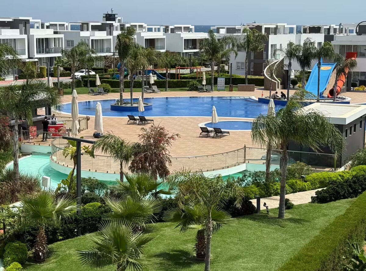 Villa in the TOP 5% on Airbnb. 5 minutes from the beach, aqua park and casino of Acapulco Hotel, 20 minutes to center of Girne. The house has large cinema, massage chair, luxurious marble furniture, panoramic magical views. Electric transport is provided free to the guests! This exquisite twin-villa (duplex) in gated complex with three pools has privat garden, font, an olive tree house, ping pong, mangal, swing, trampoline and two fountains. Two shops, two restaurants and a cafe near the house.