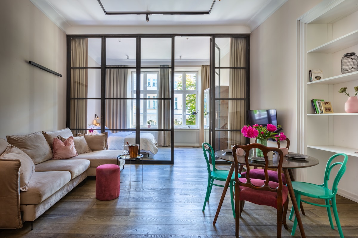 Pristatome butą su oro kondicionieriumi ir antresole. Miegamasis po stikliniu stogu ir ištisus metus veikianti lauko SPA zona neabejotinai yra „vyšnia ant torto“. Jaukiame 2-4 asmenų bute su liftu taip pat yra svetainė, įrengta virtuvėlė, vonios kambarys su skalbimo mašina ir automobilių stovėjimo vieta požeminėje aikštelėje. Puiki vieta centre užtikrina greitą prieigą prie daugelio lankytinų vietų.