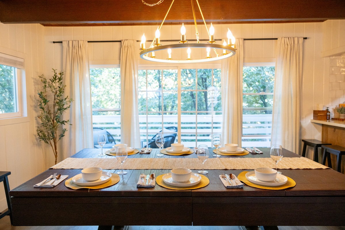 Atsipalaiduokite šioje stilingoje, senovinėje trobelėje. Prabangūs patogumai: 1. Pilnai paruošta virtuvė su „Le Crueset“ puodais ir keptuvėmis, „Kitchenaid“ prietaisu ir daug daugiau. 2. Patogi ir stilinga svetainė su Sonos garso sistema ir televizoriumi su garso lenta ir žemųjų dažnių garsiakalbiu. 3. Didelis ir rafinuotas valgomasis, kuriame galėsite mėgautis gurmanišku maistu arba naudotis biuro erdve. 4. Trečias akras apsuptas miško ir privatumo. 5. Didelė lauko terasa, kurioje galima pavalgyti su gamta.